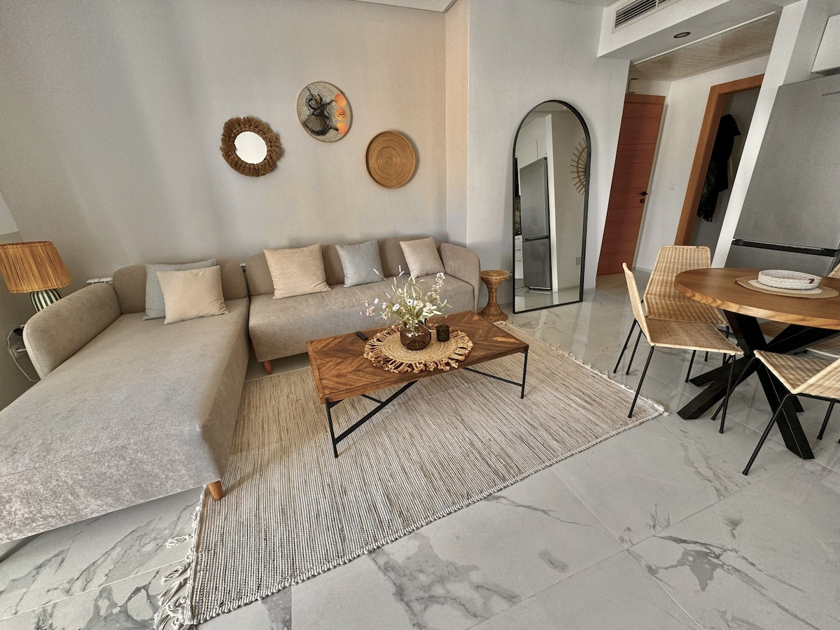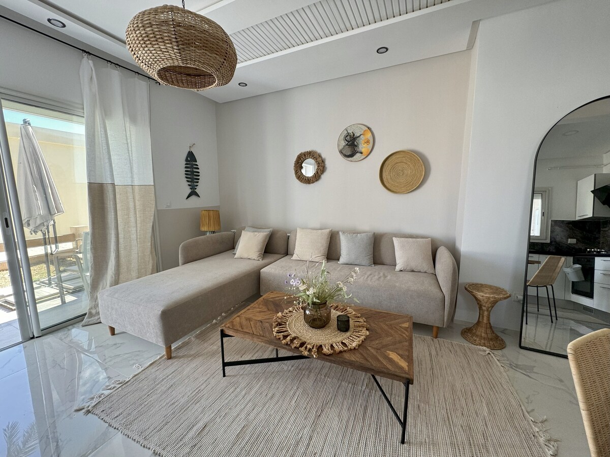 High-end design apartment of 120 mÂČ (70 mÂČ interior and 50 mÂČ terrace), fully equipped and ideally located in a quiet neighborhood of Monastir. The terrace, furnished with garden furniture, a parasol, and exotic plants, is perfect for relaxation. This spacious, modern, and bright apartment is ideal for comfortable stays, whether as a couple or with friends. Close to amenities and beaches, it provides a unique setting to explore Monastir.