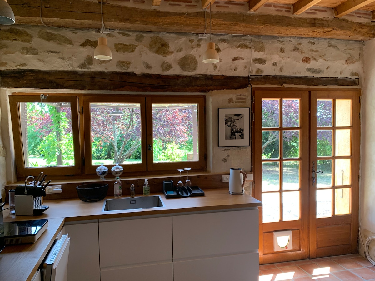 🐸 La Maison des Grenouilles – Rustic gîte in the heart of the Gers valleys. Come and discover our little corner of nature in the heart of little French Tuscany, far from the hustle and bustle of the city. Charming 70 m² cottage renovated in a country spirit, ideal for 2 to 4 people. High ceilings, exposed beams, wood stove, private terrace overlooking the pond and frogs. Cool in summer, warm in winter. Access to the pool, garden and shared games.