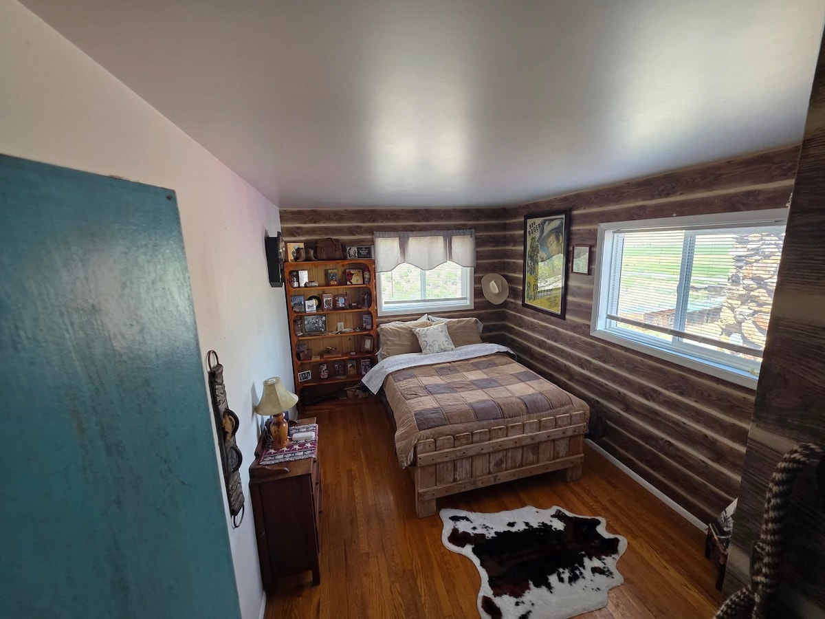 Living room with open bar to kitchen. One bedroom with two queen beds and a big closet with ironing board. Fully equipped kitchen with a fridge, stove, and microwave. Laundry room with washer and dryer. Bathroom with claw foot tub/shower, sink, vanity, and toilet. Warm and cozy cabin/ farmhouse feeling. There is no backyard access. Quiet neighborhood