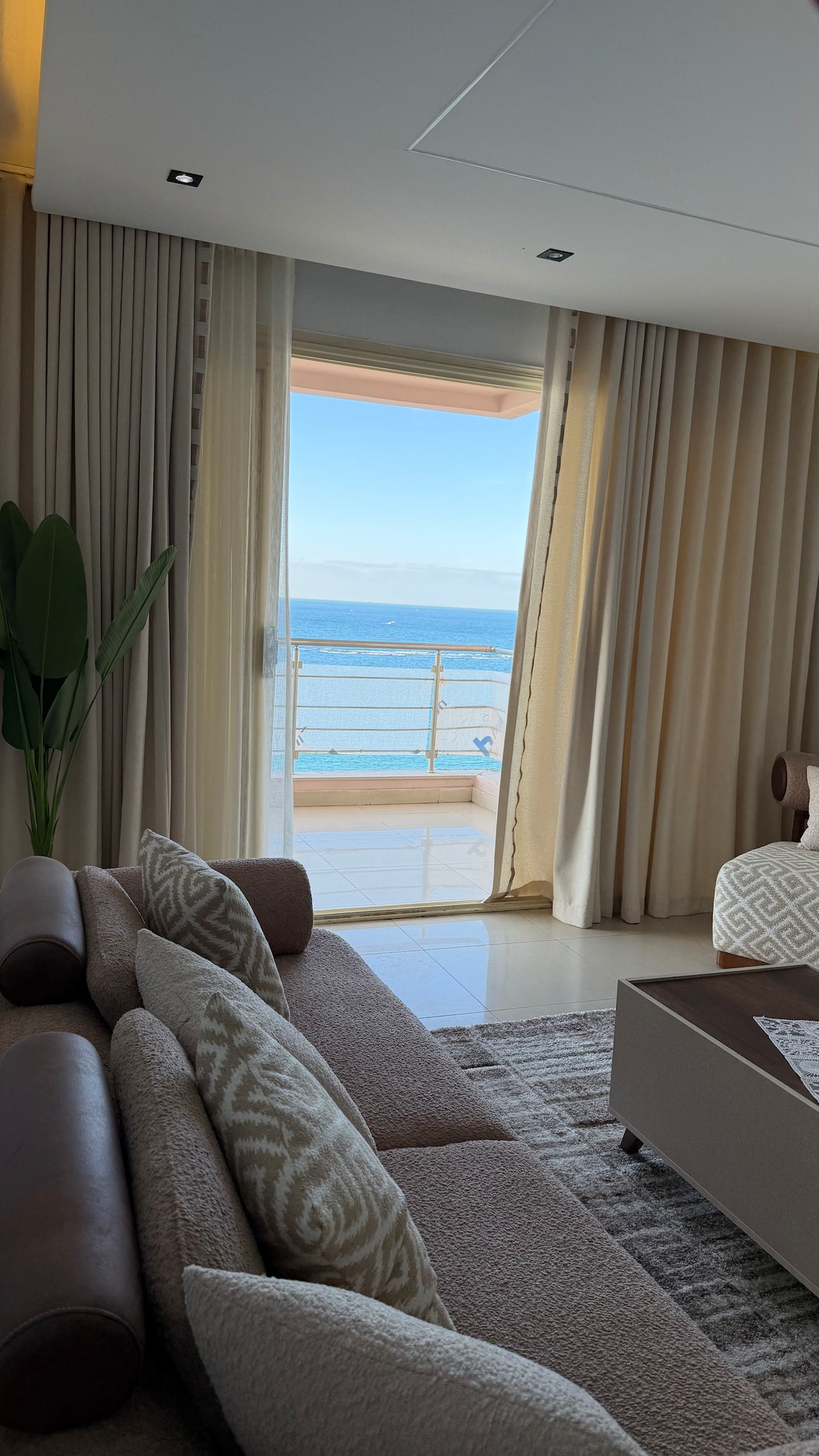 A distinguished apartment on the beach of Alexandria in the Montazah area. It consists of three bedrooms with 6 beds, two bathrooms, a large hall containing a dining room, a salon, and a living room. In addition to a sea view across the width of the hall. And a large balcony containing a sofa and chairs made of wicker and classic beads. The apartment is located on the ninth floor, giving it a unique view of the beach that you will never see before.