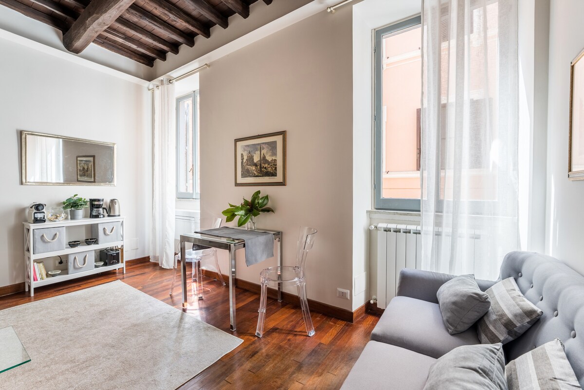 Light the large stone fire and relax with a book in this elegant home overlooking Via dei Banchi Nuovi. Coffered ceilings cap cozy rooms in relaxing, neutral tones accented by designer furnishings and owner's original paintings. This charming fully renovated house is located in one of the most beautiful, ancient and vibrant area of the center of the Eternal City. We also like to offer eco-sustainable hospitality: we use electricity from renewable sources, organic products.
