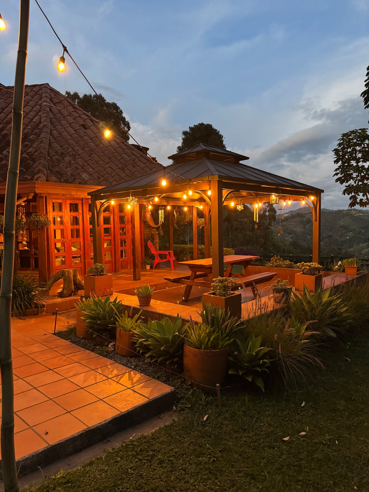 Relax in our rustic cabin ideal for short and long stays that has all the comforts of home with the difference that you will be surrounded by nature and see shooting stars. You can enjoy the outdoor jacuzzi with a bubble massage, catamaran hammock and fireplace, The kitchen overlooks the Ruiz snow-capped mountain and the beautiful mountains. the bedroom has a phenomenal view of the sky, mountains and Ruiz snow. The bathroom is outdoors in guadua and hot water.