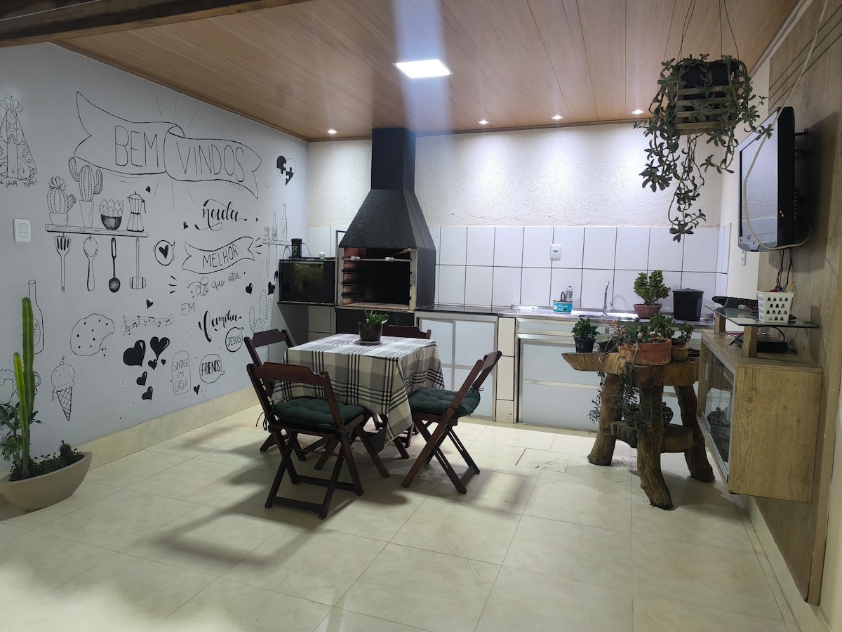 Large house with 2 floors, American-style kitchen, with dishwasher, microwave, electric oven and inverse duplex refrigerator; TV room with sofa bed, 65-inch TV with Netflix, Amazon prime, YouTube premium, outdoor area with barbecue and industrial stove; 3 air-conditioned bedrooms, one of which is a suite; 1 bathroom on the 2nd floor and a toilet on the ground floor; service area with washer and dryer, ironing board and iron; and garage for 2 cars.
