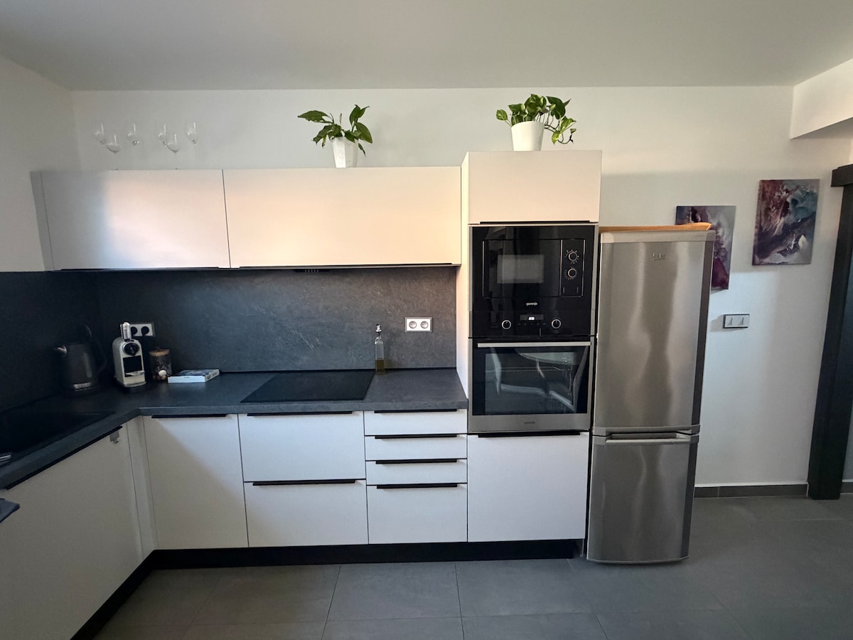 My house is situated in beutifull town in small distance from Bratislava.(20min) Area is very private with all new-build houses around, very close to vineyards and woods close by. It' s suitable for 6people. Downstairs area consists from one large open living area with large sofa, television and kitchen with all equipments, dishwasher,fridge-freezer,oven,microwave and all electrical appliances needed. Upstairs have 3 large bedrooms. Every bedroom have a smart TV. One Bathroom with bath,shower,toilet and washing machine. The house is perfect for larger families,group of people,couples or alone travelers for holiday or business trip, good for few-days stay, longer stay. Outside have a large garden with small swimming-pool,large patio with BBQ grill,lovely sitting area for summer days.
