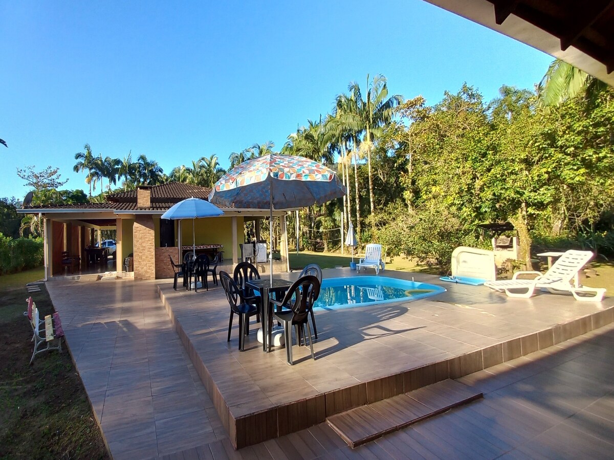 Farm located in América de Baixo - just 2 km from downtown, access by rural dirt road. Farm containing: swimming pool, trampoline, pergola, vegetable garden, pool table, swing for children. The Yporanga River passes in front of the farm, a clean river with calm waters that is perfect for children. House containing 3 bedrooms, living room and kitchen with integrated environments and 2 bathrooms. Our accommodation is for 6 people (we do not rent to more people)