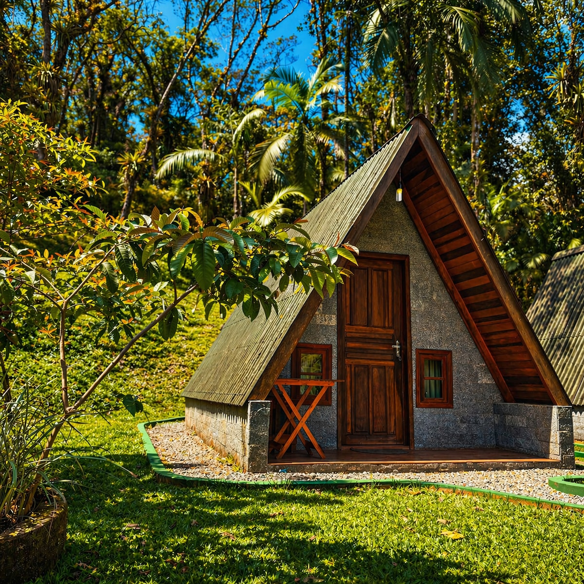 A simple and rustic cabin, but full of comfort and charm — the perfect getaway for those seeking tranquility and romance! You will be surrounded by lots of greenery, birds and a unique experience with the farm animals. To relax, enjoy a private whirlpool and, at night, gather around the fire pit to experience a luau.