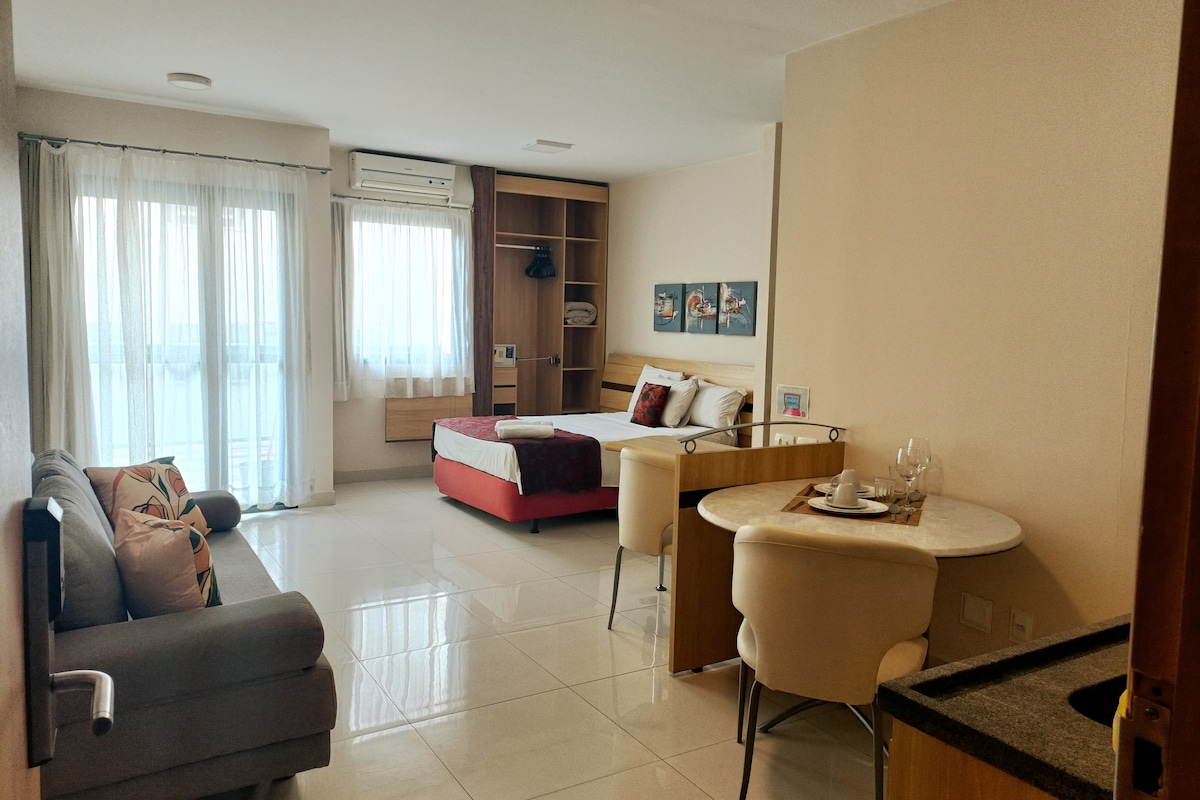 Extremely cozy flat equipped with everything you need for a perfect stay. The convenience features a fully ventilated bedroom and living room, private, air-conditioning for those who like a cooler environment, an incredible view and a perfect location for you to do everything you need nearby. In the building, you have total security, a parking space and an incredible pool for you to cool off and relax on the hottest days. * EXCELLENT LOCATION *