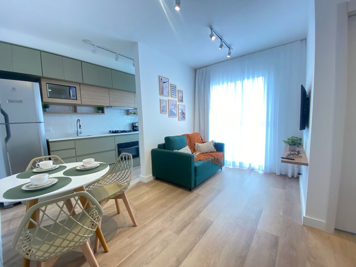 Apartamento com 2 quartos, moderno, aconchegante e com uma vista agradável, combinando conforto, praticidade e modernidade. Localização privilegiada perto dos melhores pontos turísticos do Rio de Janeiro: - Escadaria Selarón, Museu do Amanhã, Roda Gigante, AquaRio, aeroporto Santis Dumont e muito mais. Ar condicionado nos quartos, TV smart, internet rápida e mesa para 3 pessoas. Condomínio com piscina, sauna, playground, portaria 24h, co-work.
