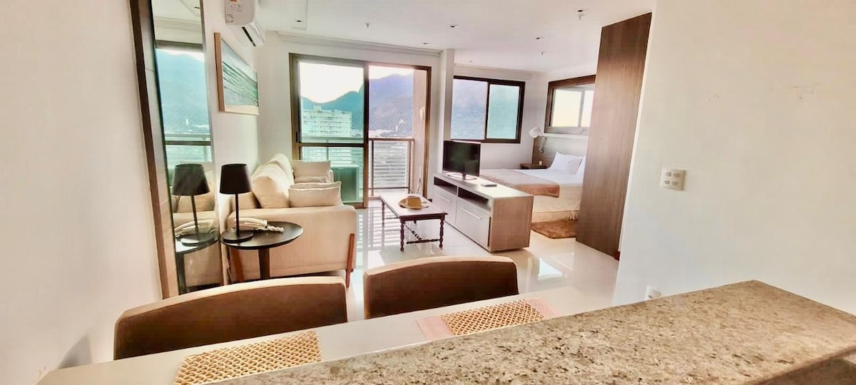 The apartment has a split air conditioner of 18,000 BTUs, a 42" smart TV in the living room, Wi-Fi, a minibar, an electronic lock, an induction stove, a double bed, a 1000-thread count sheet set, a sofa bed that opens to 1.80 m, a high floor (13th floor), a touch-screen purifier, a balcony, a view of the mountains, and a quiet location. Free parking. Swimming pool, Jacuzzi with hydro-massage (no medical certificate required), sauna. It is 9 kms from recreio beach and 4.5 kms from Shopping Metropolitano BARRA.