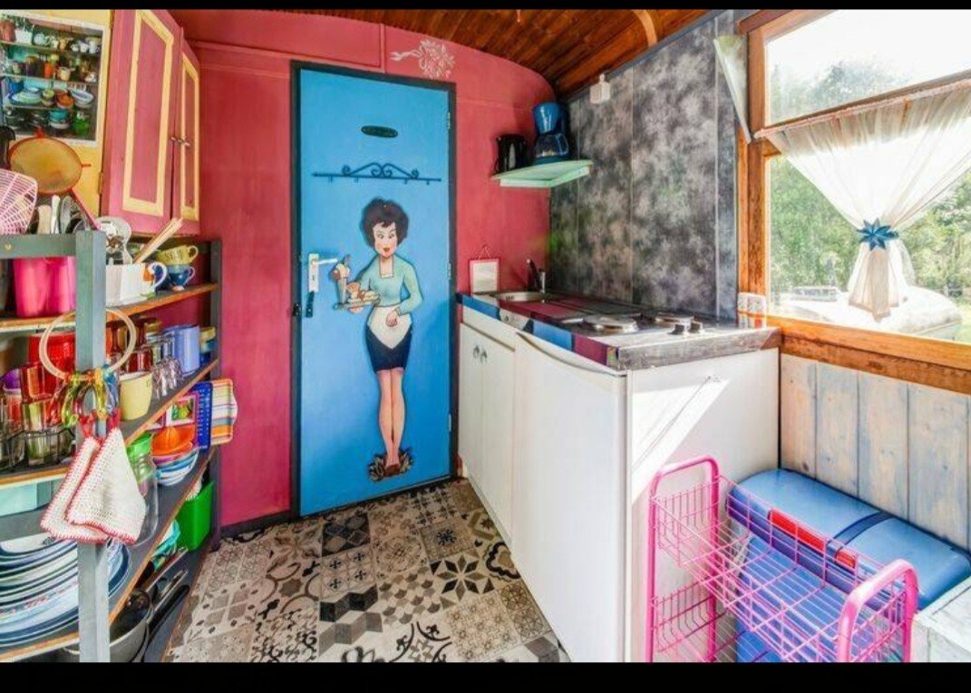 Unusual stay in a camp of authentic and colorful trailers, set in a quiet area by the stream. The space can accommodate a family of 5 people. 3 trailers offer a double bed ready on arrival. The 4th contains a kitchenette, dining area and bathroom. Outside: table, chairs, deckchairs, brazier, etc. "Digital detox" place, without TV or WiFi. There is also a common area nearby with playground. Extra charge: Hottub jaccuzi/sauna.