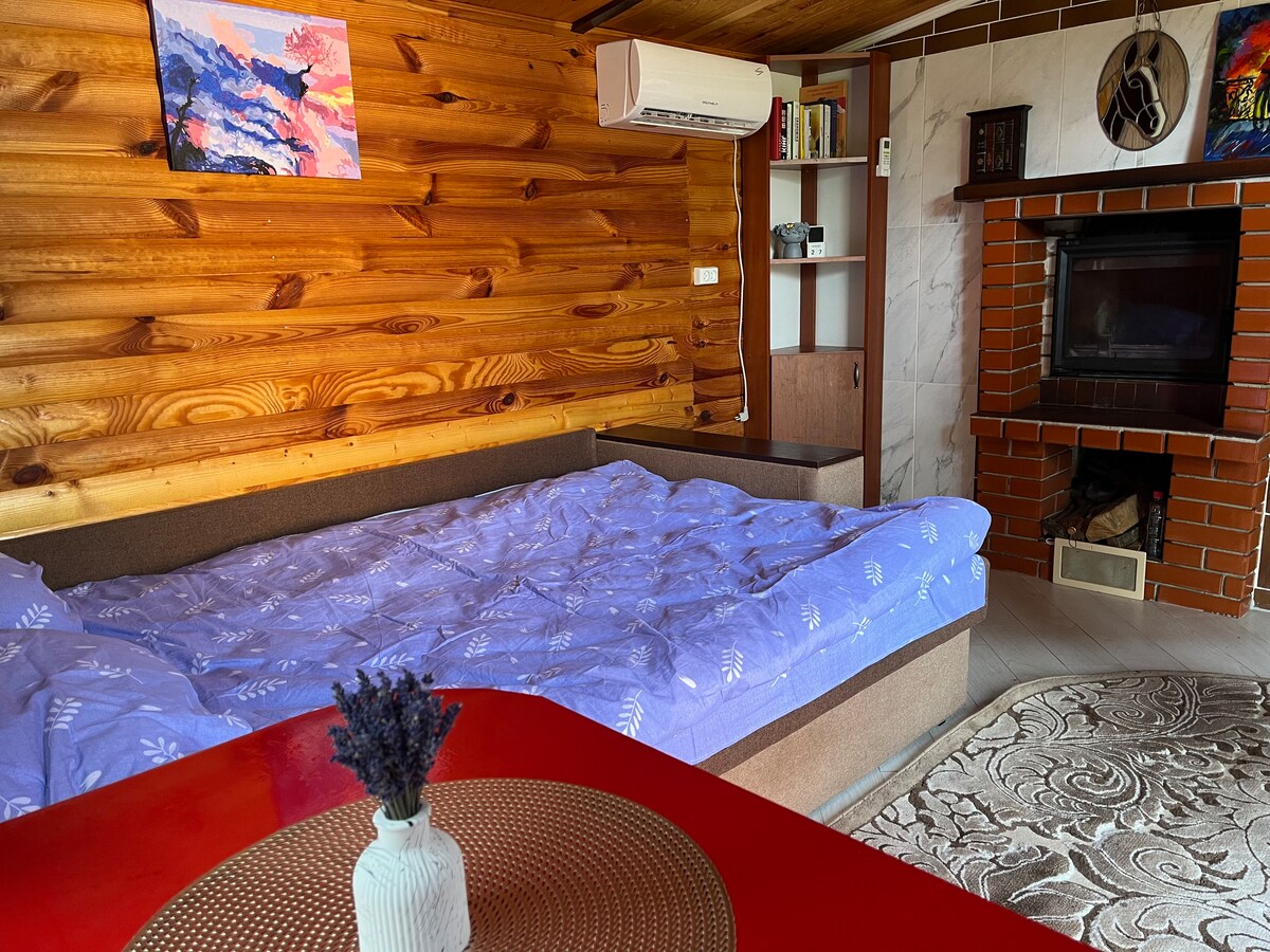 🌿 Romantic double Cottage No. 5 in the Bilychi estate is your private mini-space in the Carpathians. Morning coffee on the terrace overlooking the pines and the mountain river. Inside: large bed, kitchen unit (kettle, microwave, refrigerator, utensils), Wi-Fi, TV, air conditioning, heating and warm floor, shower room. There is a private beach and a BBQ area with gazebos on the territory. On request — a wood-fired tub and tips for walks and romantic places 💛