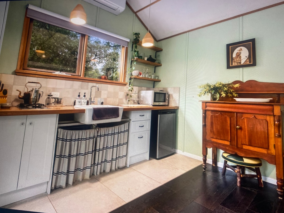 Escape and relax in this cozy forest cottage nestled amongst the gumtrees. This is the prefect location for bushwalks, mountain biking, winery visits or the other wonderful attractions this area has to offer. This cottage suits singles or couples (infant). This private cottage has all the modern amenities you need. Outside you can find a bath tub , BBQ, and seating. Inside there is a woodfire (provided w/ wood), queen bed, TV, fully equipped kitchen incl. coffee machine. Bathroom w/ shower.