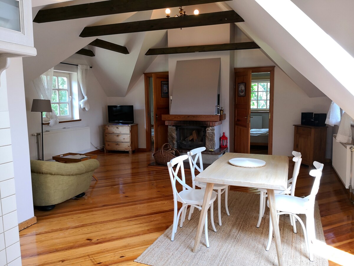 You will stay in a detached wooden house separated from the rest of the yard. Pure nature. From the terrace, you have a great distant view of the hilly meadow landscape. There you can also enjoy the sunsets. It is 25 m to the courtyard area, where you can also use the conservatory and the bar as well as the lake terrace. The house is heated with a fireplace, which also supplies the upper floor through air drafts. For this, you have to take care of the lighting.