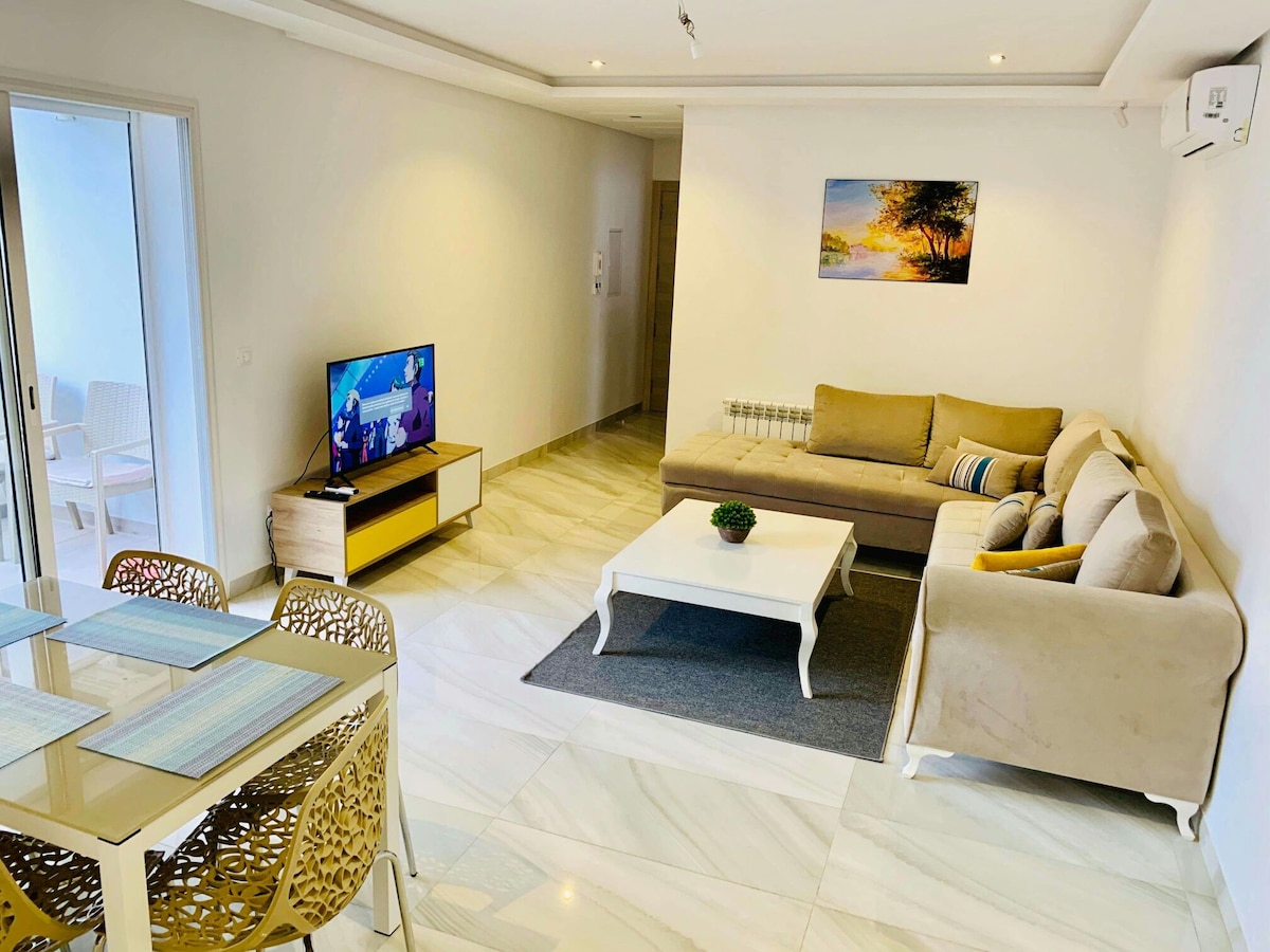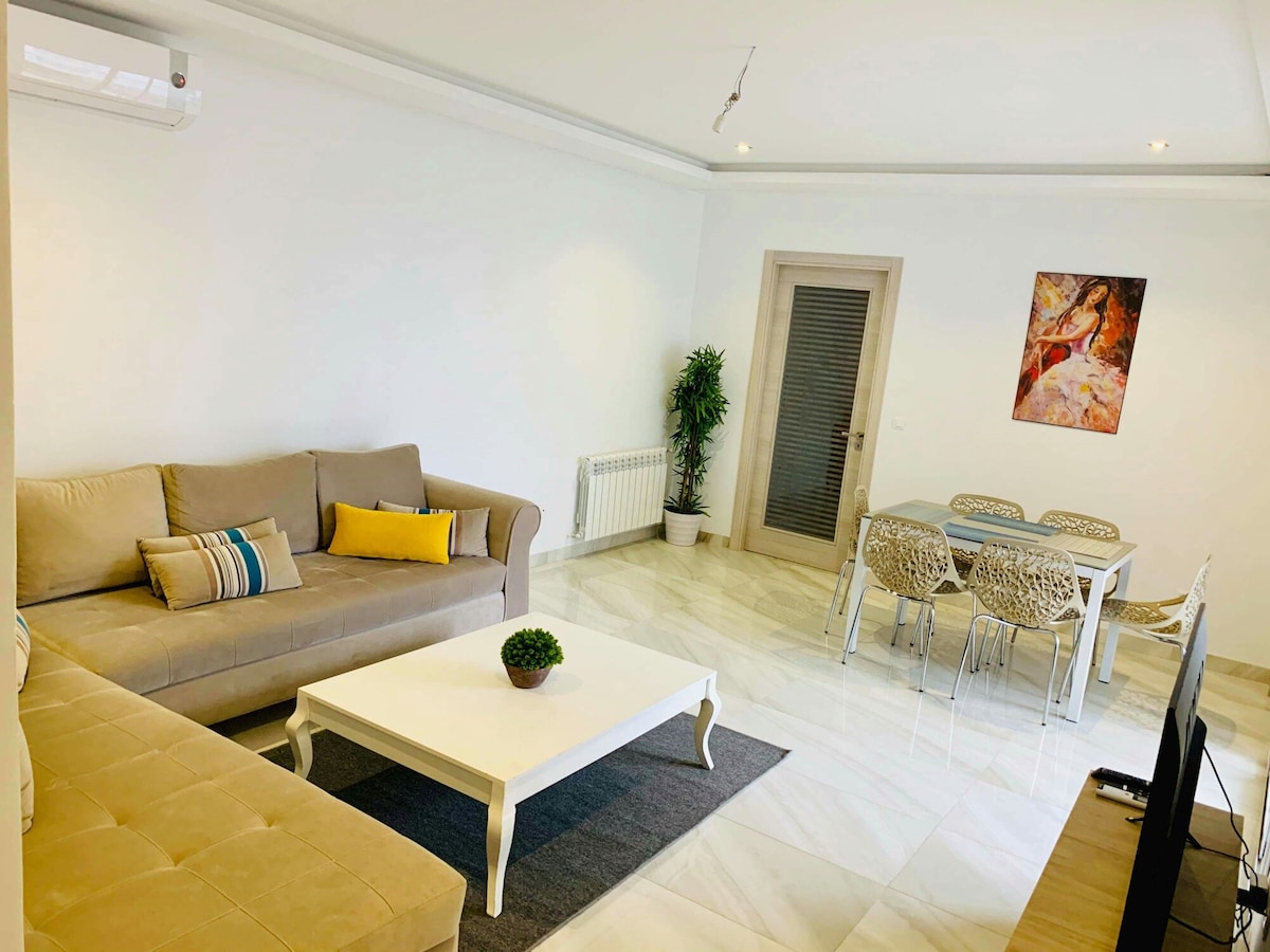 Spacious and bright apartment close to the beach, located in the heart of the North Hammamet tourist area, quiet and very discreet neighborhood. Secure luxury residence in a residential area, shops and leisure nearby (Restaurants, banks, water park, bars...)