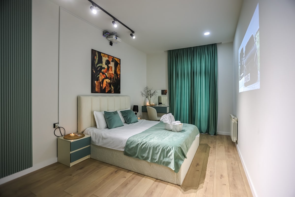 Indulge in elevated living in this exquisitely renovated apartment set in a historic building on Rustaveli Ave, Lesia Ukrainka St—one of Tbilisi’s most prestigious addresses. Each room opens onto a private balcony, blending charm with light-filled elegance. Featuring a serene bedroom with an orthopedic mattress and a spacious living area with sofa bed, plus Smart TV, cinema projector with popcorn, designer kitchen, bathtub, robes, and premium amenities—crafted for a truly luxurious stay.
