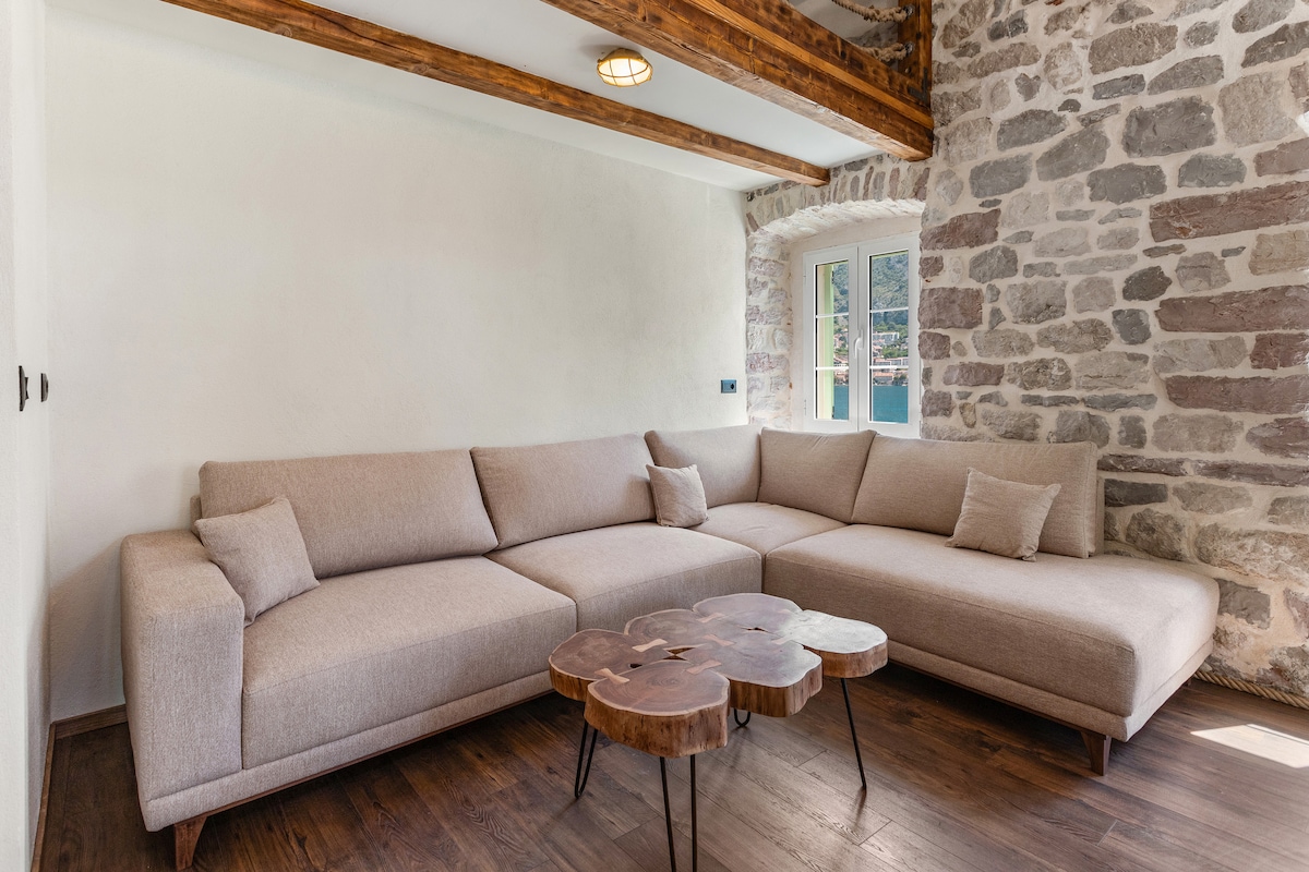 This waterfront old stone house was originally built in 19th century and completely renovated in 2018. The interior represents a mix of a traditional Mediterranean style combined with modern design. Set in a peaceful old fisherman village called Muo, our house is perfect base for exploring the Bay. The Old town of Kotor is less than 10min driving distance while Tivat airport is less than 20min away. The house has three levels and each level has undisturbed sea views.