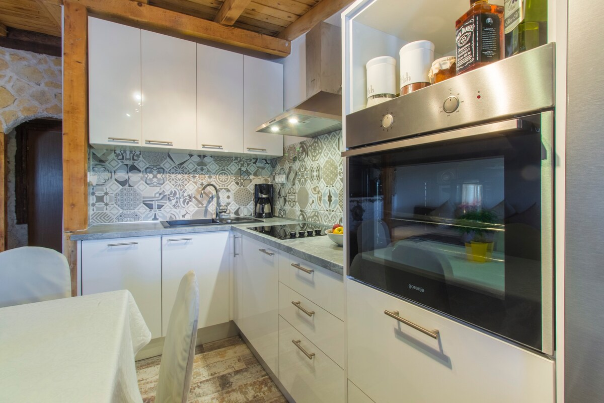 Apartman se nalazi u obnovljenoj tradicionalnoj kući samo nekoliko koraka od mora (5m) i oko 100-150 m od centra grada gdje ćete pronaći trgovine, restorane, ljekarne i još mnogo toga. Gostima je na raspolaganju cijeli prekrasan apartman s dvije spavaće sobe, potpuno opremljenim dnevnim boravkom i dijelom terase. Terasa je privatna za goste naše kuće koja sadrži još jedan apartman za dvije osobe. Na terasi se nalazi vez za brod. Svi troškovi su uključeni u cijenu, posteljina, ručnici, klima itd.