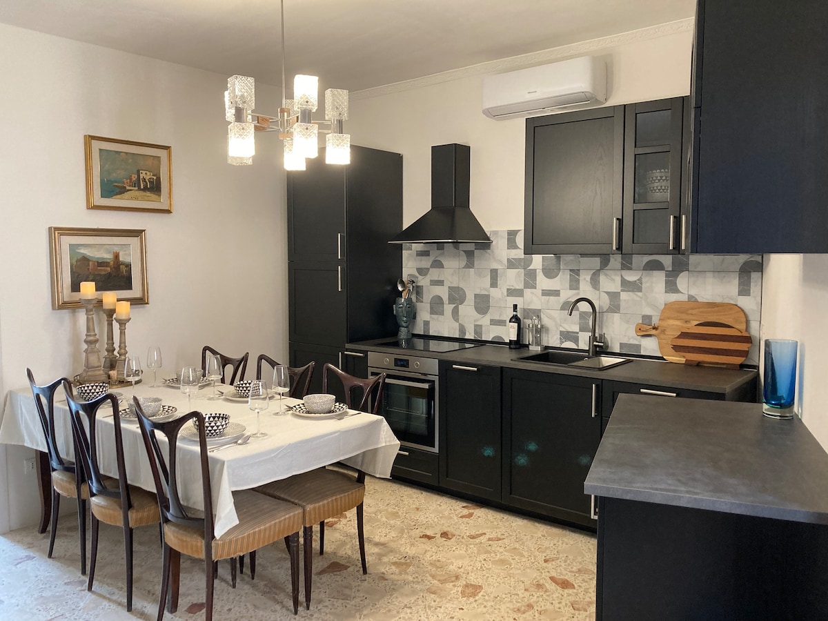 The large apartment (about 200 sqm) with fine finishes has three large and elegant bedrooms with private bathroom, a kitchen with induction cooktop, a dining room, a living room, and a terrace. It features decorated floors, walls with original stone parts, and classic furnishings with antique pieces. It is located in an ancient building overlooking a characteristic staircase in the heart of the city, a few steps from Via Atenea, the most beautiful and elegant street in the city.