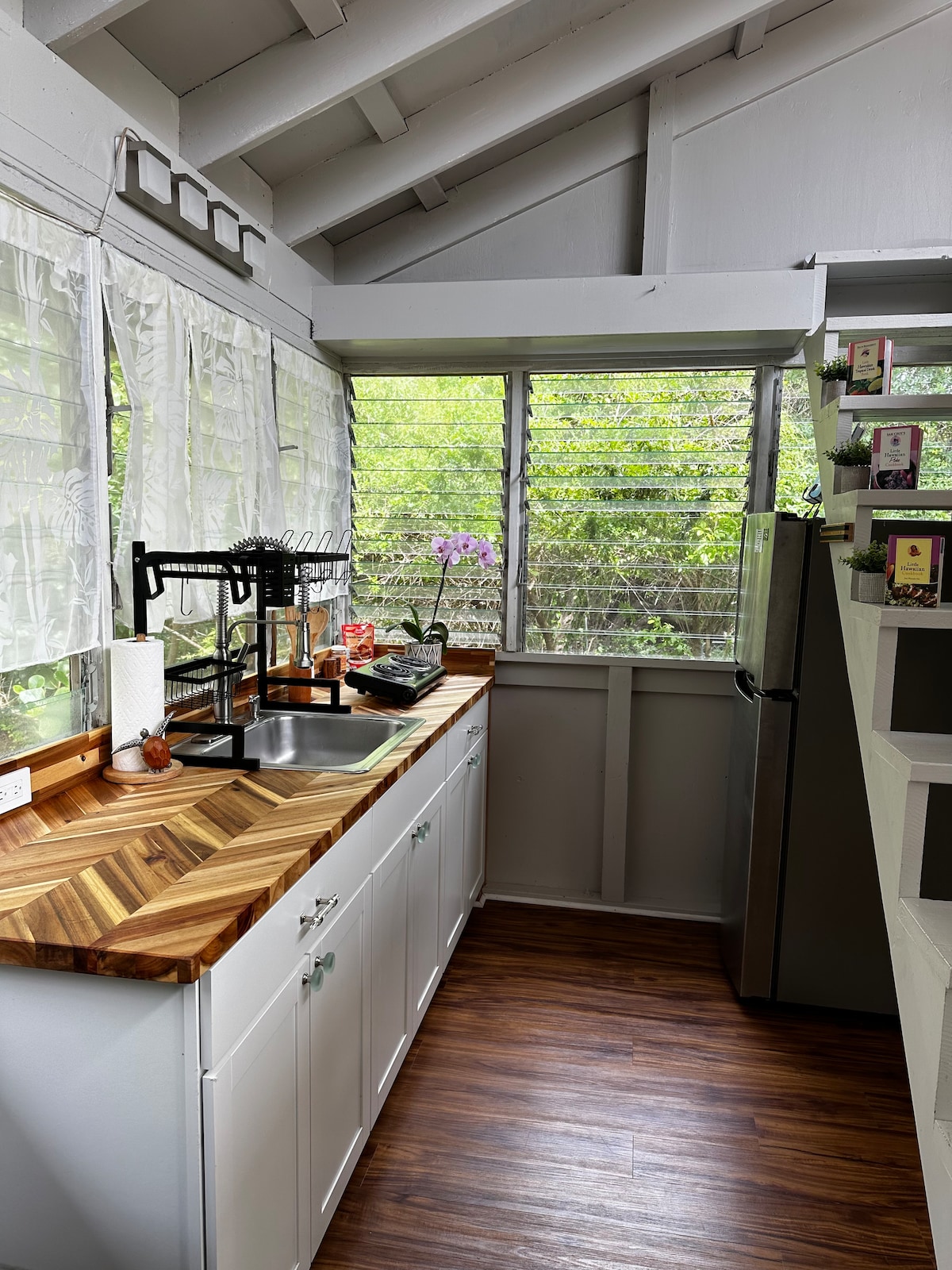 Kanaloa (God of the Sea creatures) over looks the Ocean, this room is 140 sq ft, with a queen bed, small table with chairs, no kitchen, large window to view Milky Way, sunrises, all while laying in bed. Kanaloa has its own private composting toilet 25’ from the room, bathroom sink, beach shower. A glamping room for short stays for those wanting a lower nightly price, clean, comfortable, getaway, close to Green Sand Beach and other popular place.