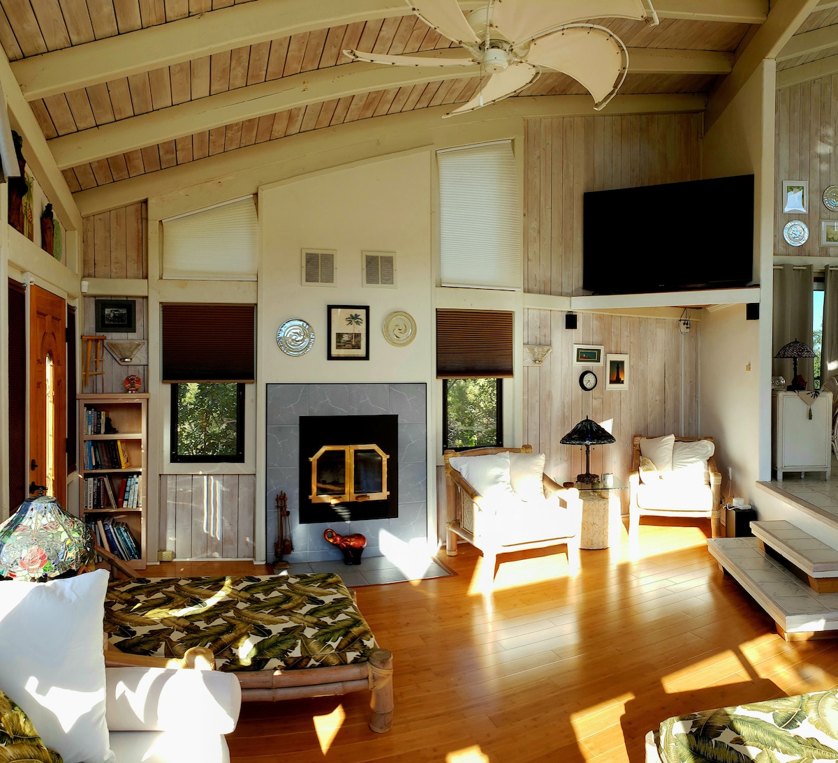 This quiet mountain hide-a-way offers peace and serenity in a rural location close to Hawai'i Volcanoes National Park. The private home has covered private lanais with eating areas, lounging areas and a fire pit. Interior spaces have a unique Hawai'ian vibe with sophisticated decor. Picture windows along the back side of the hale provide uninterrupted views into the rainforest. A full chef's kitchen provides a perfect space to prepare family meals.