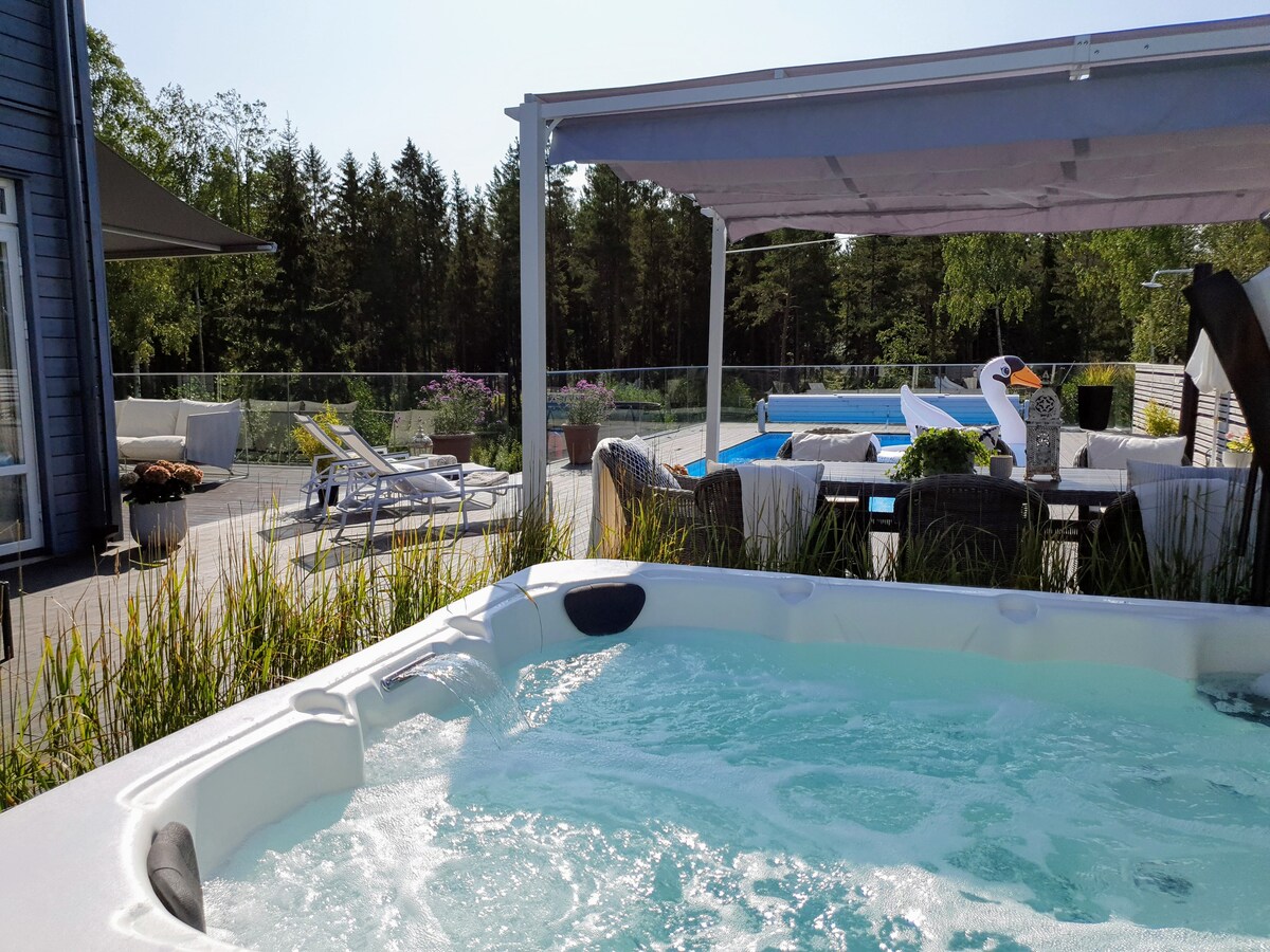 Our stunning home was completed in 2013, it is built on a cliff overviewing the waterways leading into Stockholm. South aspect with views stretches from east to west. Private beach, jetty and wood fired sauna . The house has one master bedroom, 2 bedrooms plus a small cabin (guest house, bedroom no 4, available summer time only). The deck has a lounge, hot tub, outdoor kitchen and open fireplace/BBQ. We are located 30 min from downtown Stockholm, 10 minutes from a shopping centre.