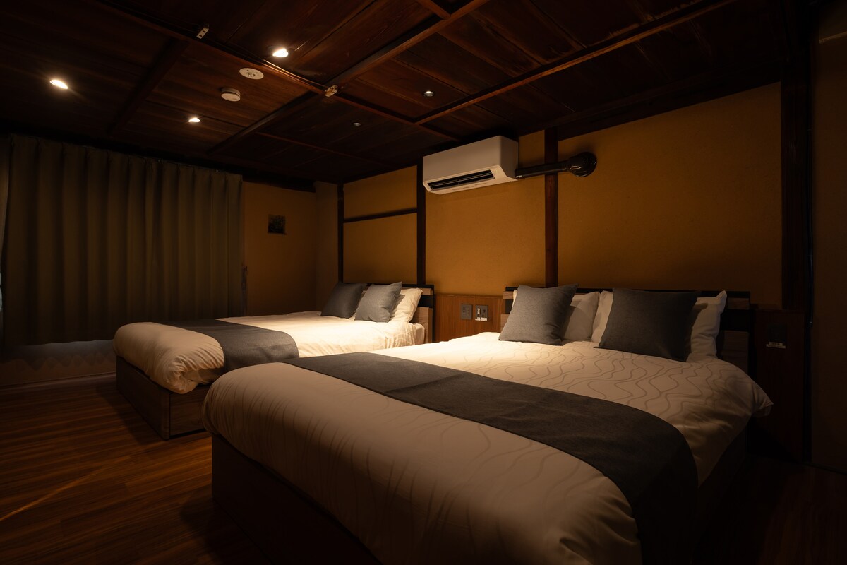 The bedroom features two spacious double beds with crisp white linens and coordinating pillows. A bedside table with a lamp is positioned next to each bed. The room is well-lit, showcasing a blend of modern and traditional Japanese elements, including sliding doors leading to a separate area.