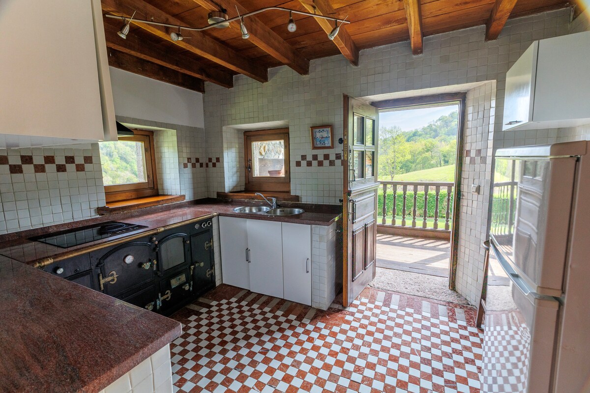 Beautiful country house, with a fantastic location one kilometer from Villamayor and next to the mountain, to enjoy all the emblematic places of Asturias next to the CASCADA DEL CHORRON trail, CUEVA DEL SIDRON MONTE DEL SUEVE, DESCENSO DEL SELLA... accommodation with barbecue, independent garden, parking inside the house, perfect for children, and for adults, a hydromassage bath and double beds, a kitchenette, a large living room with a fireplace and pellet stove