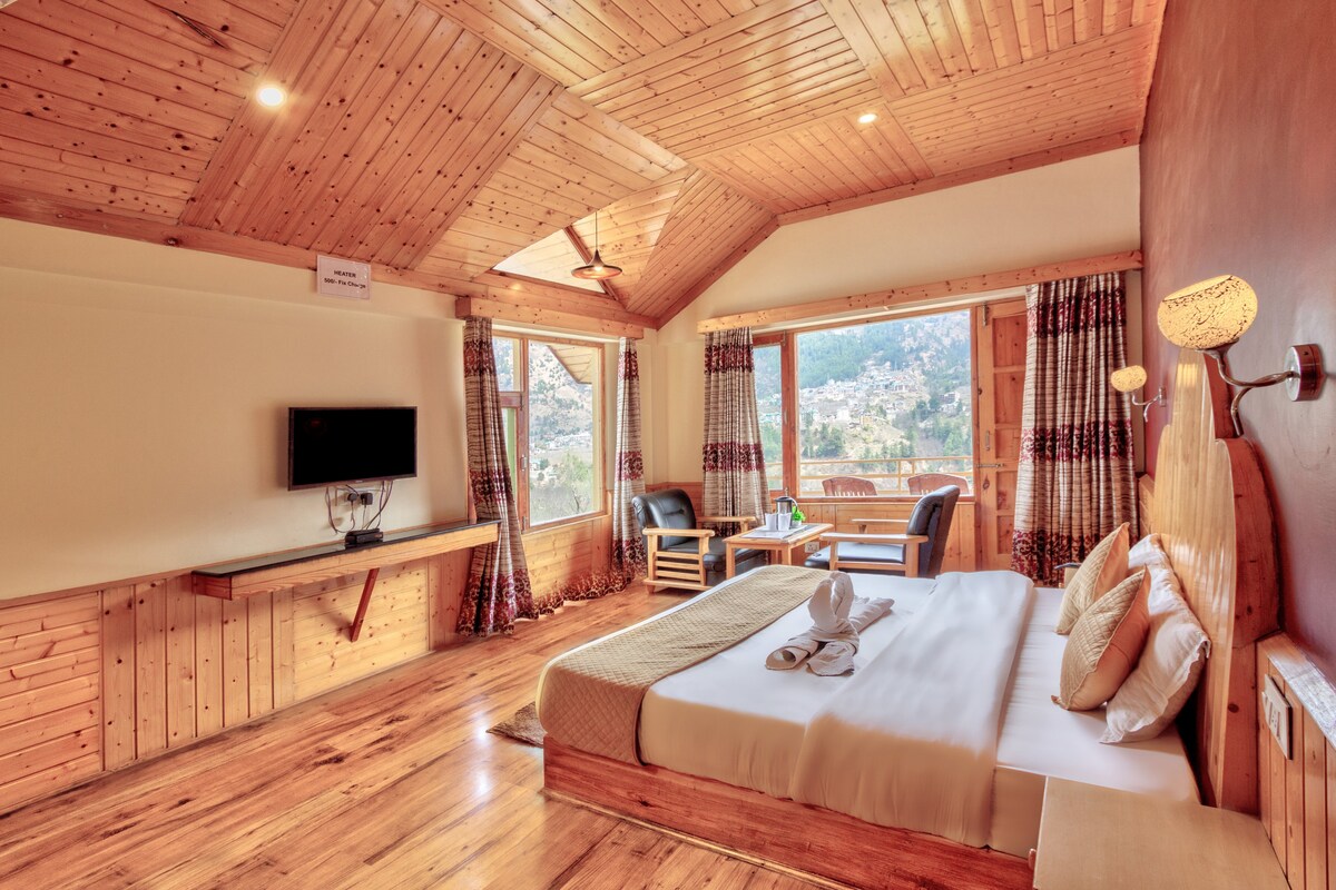 Welcome to our fairytale 'Evara' – meaning 'gift of God.' Nestled in the tranquil village of Naggar. Evara is a beautifully crafted wooden duplex cottage offering peace, comfort, and stunning mountain views. Surrounded by lush apple orchards and nature's quiet charm. This serene getaway features balconies on three sides, allowing you to soak in breathtaking vistas from sunrise to sunset. Warm & cozy interiors, a full kitchen, and a luxurious Jacuzzi to unwind after a day of exploring.