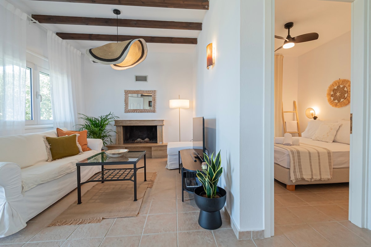 Villa into Sani's pine woods forest. 20' on foot from Koutsoupia beach, Sani beach, Sani Resort and Marina. Garden and balcony in addition to the unique scenery to spend quality time with your loved ones. Private parking spots: 2 The unique position of our villa ensures that you get both the relaxation you seek but also you can have all the amenities that Sani Beach Provide.