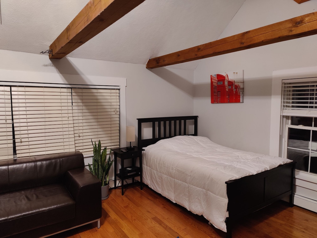 Private entrance master bedroom w/exclusive use attached bathroom. Studio-like room; exterior staircase entrance. Walk to Wellesley College, town center, commuter rail, restaurants, grocery. Short drive to Babson. Sizable room, tasteful decor, king bed, sofa, microwave, mini-fridge (NO TV/NO KITCHEN). High-speed wifi, deck, view of treetops. Safe suburban neighborhood; good walk trails, walk to tennis/spa/gym/yoga w/reasonable day fees.