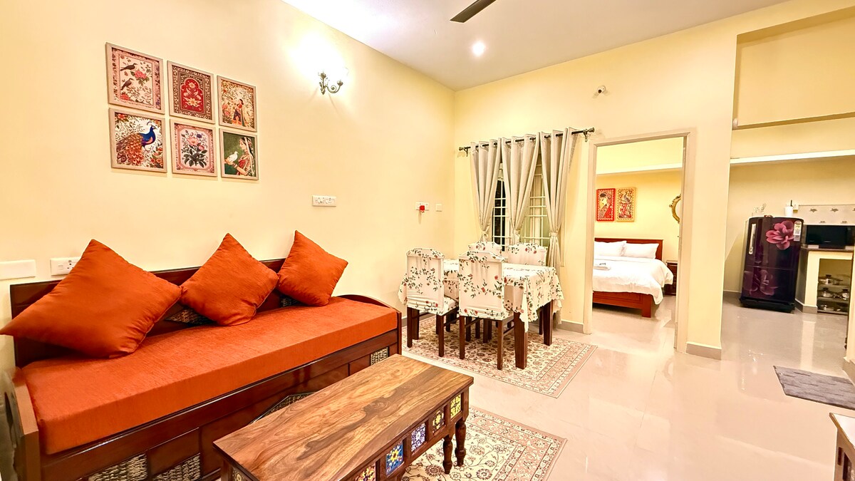 Your home away from home in Auroville has been tastefully decorated to a Chettinad theme. Every corner of our home is Instagramworthy with colourful interiors, kolam art, antique decor and more. The 1BHK can comfortably accommodate up to 4 persons with a swing bed and sofa bed in the living room. hile there are plenty of restaurants nearby, our kitchen has been thoughtfully equipped for all your needs - be it to make a quick omelette or a full Indian meal. So sit back, relax and sip your coffee.