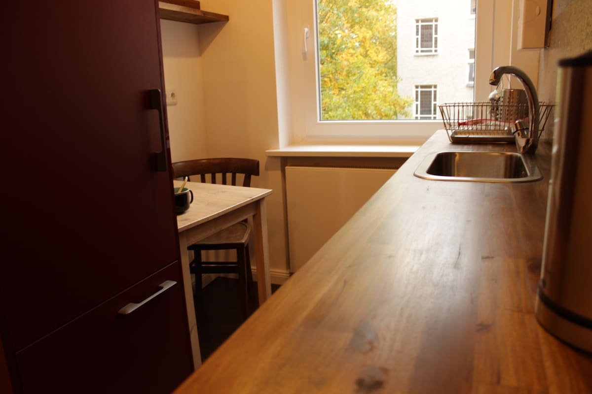 Our garden view studio style apartment for singles or couples with all amenities incl. wifi, washing machine, dryer, dishwasher + smart TV, located on the ground floor of our apartment house on the Neukölln / Kreuzberg border is ready for you. We are located just 1 minutes walk from a transport hub, shopping district, bars + restaurants ... and walking distance to Berlin's Tempelhofer Feld + parks + canals.