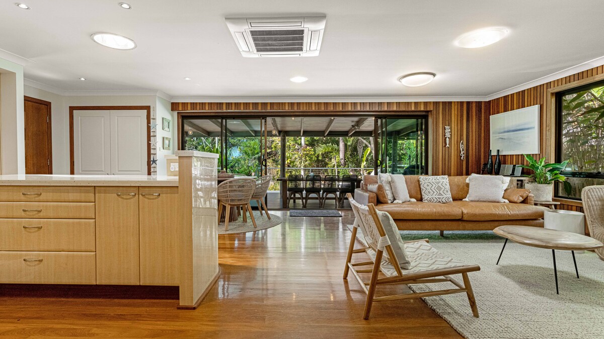 Own private beach access. Beautifully designed & spacious Beachfront abode with AC, situated in the Idyllic village of New Brighton, a short drive to Byron Bay. It truly is an outstanding location to relax, unwind and have an amazing break. Surrounded by a lush, tropical garden, & only 20 steps to a pristine surf beach with private access. Watch the sunrise & Whales play from your own backyard. Fall asleep to the sound of the Ocean song. Basket ball hoop, Ping pong & game 2 min walk to shop/cafe
