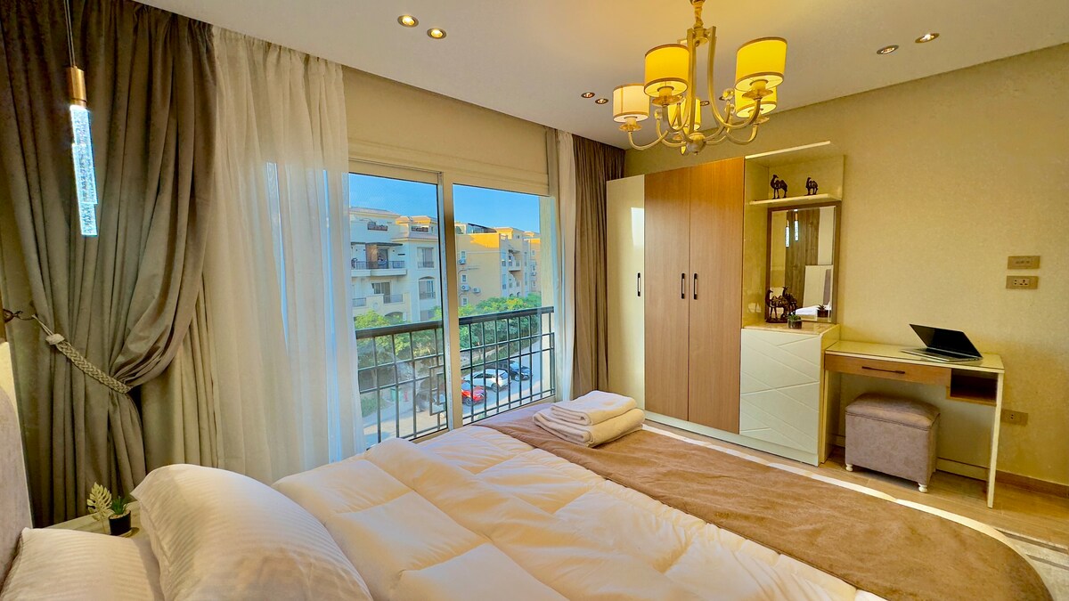 Kick back and relax in this calm, stylish space located in the heart of the 5th Settlement. The place is furnished and decorated to the highest level with a fully decked kitchen, a comfortable bed, free wifi access and a TV with all your show and movie needs.