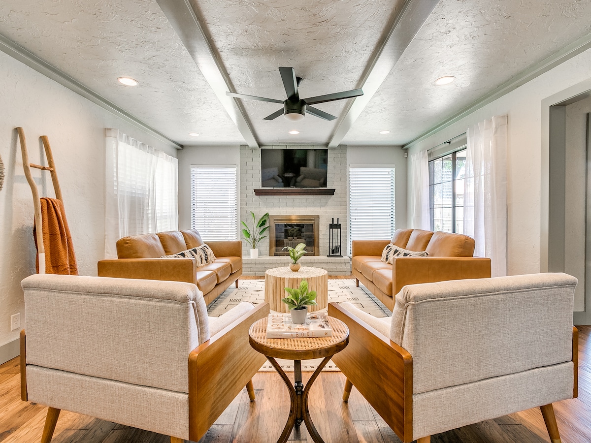 THIS IS A DUPLEX. Very quiet 3 bed 2 full bath offers unique private front courtyard, and back outdoor living room with TV & grill. Modern interior filled with art. Open living/dining/kitchen. Primary bedroom suite features KING size bed, 55” Smart TV, and spacious bathroom with walk-in shower. Secondary bedroom features KING size bed and TV. Perfect location minutes to restaurants and shopping. Out of town guests only. Easy access to all major interstates. Pets allowed ($40 per stay. )