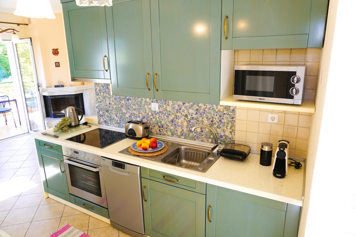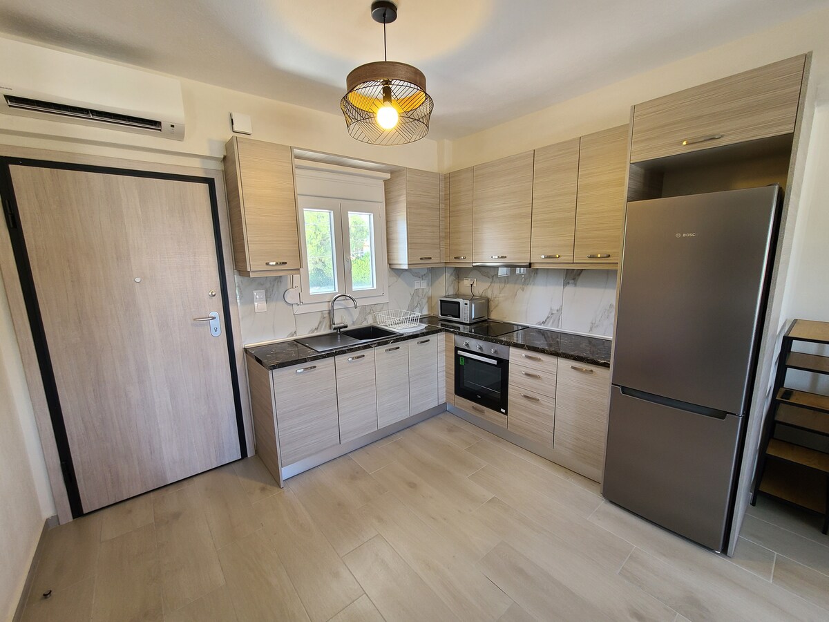 Welcome to our newly renovated 1 bedroom apartment of 54 square metres: -SUPERFAST FREE WIFI UP TO 220MBPS - 1 bedroom (with 1 double bed) - 1 kitchen and living room (with 3 single beds) - 1 bathroom - Unlimited access to large garden (850 sq. m) that surrounds the property (shared by only the 3 apartments that we own on this property) - 5 mins walk to Nikiti beach (Sithonia) KAPPA GROUND ACCORDING TO THE GREEK LAW YOU WILL NEED TO SHARE YOUR PASSPORT NUNBER WITH US AT THE TIME OF BOOKING