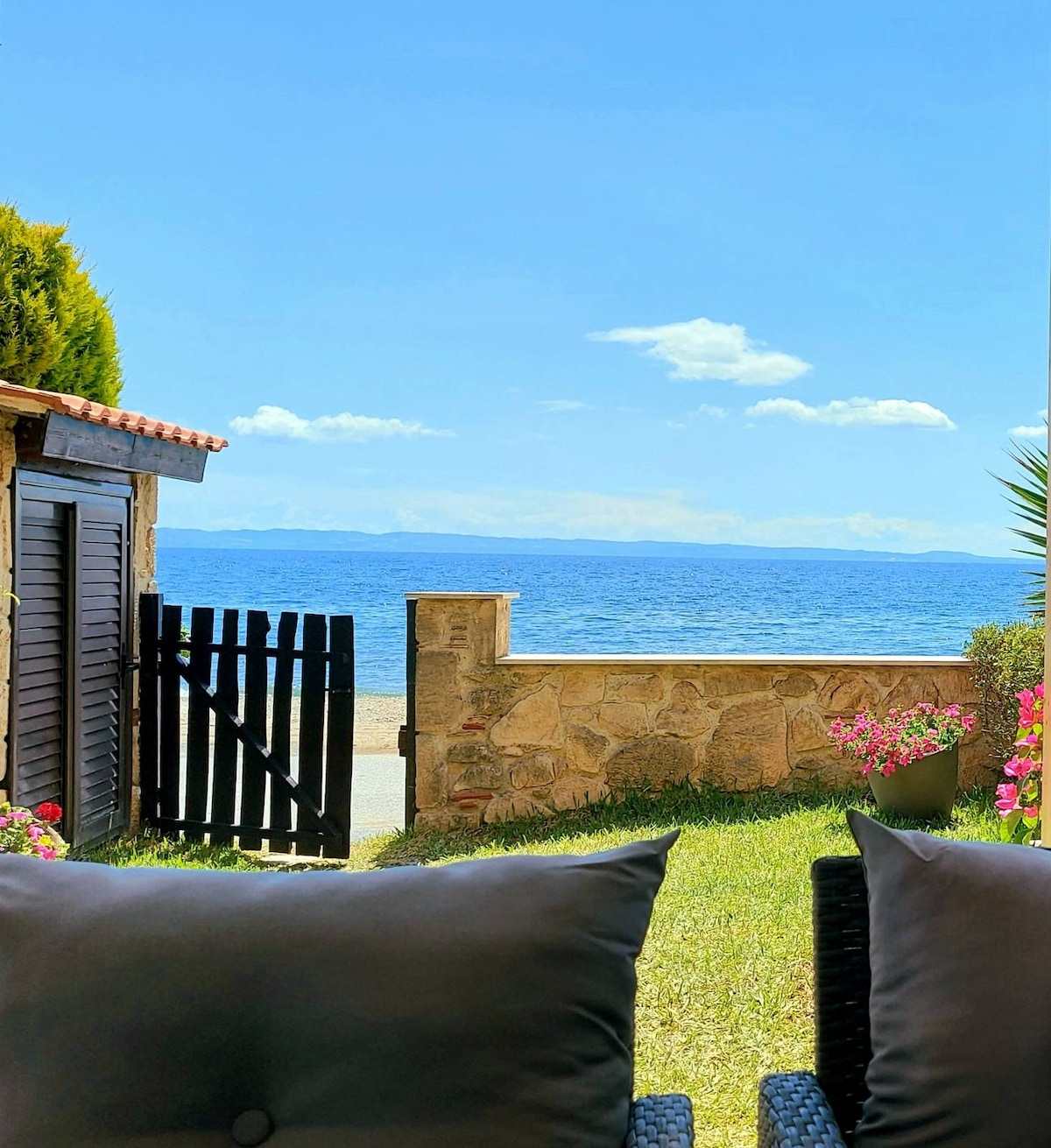You wake up, the sun is rising behind mount Athos. You enjoy a cup of coffee, while the dolphins jump on the horizon. You walk to the beach and the only thing you can hear is the sea. You cook outside, watching the boats passing by and the seagulls chasing the fish. Now, it's time for drawings and board games. Finally, you have a glass of wine, waiting for the moon to rise behind the hills.