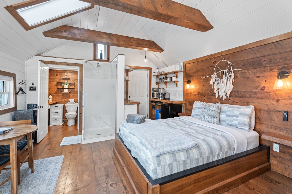 Enjoy the perfect blend of historic Huntsville in my custom crafted Coach House! Centrally located, it radiates a cozy Muskoka cottage ambiance, with historic Main Street just steps away with cafes, shops & many attractions. Enjoy lake adventures w/public docks or rent a canoe/kayak from Algonquin Outfitters. Offering stellar amenities like fast Wifi, free parking, a well-equipped kitchenette, back patio w/BBQ, hammock, Smart TV, skylights, and a comfy queen bed. Welcome to your perfect getaway!
