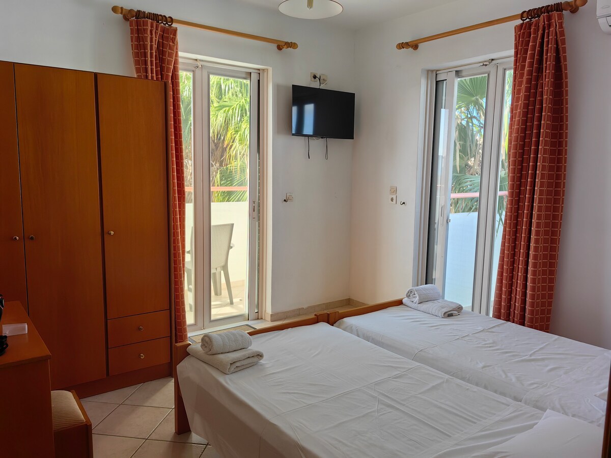 Καλωσορίσατε στα πλήρως ανακαινισμένα διαμερίσματα με μοντέρνο στυλ , κλιματισμό, καθαρά και λιγότερο από 100 βήματα από την παραλία. Με βεράντα μπροστά και πίσω για χαλάρωση όλες τις ώρες. Κοντά σε χώρους εστίασης, supermarket, στάση λεωφορείου στα 30m, ενοικιαζόμενα αυτοκίνητα κ.α Διαθέσιμο δωρεάν parking, smart TV, δωρεάν wifi και άλλες παροχές Θα χαρούμε να σας φιλοξενήσουμε και σας ευχόμαστε μια ευχάριστη και ήρεμη διαμονή στο χώρο μας!
