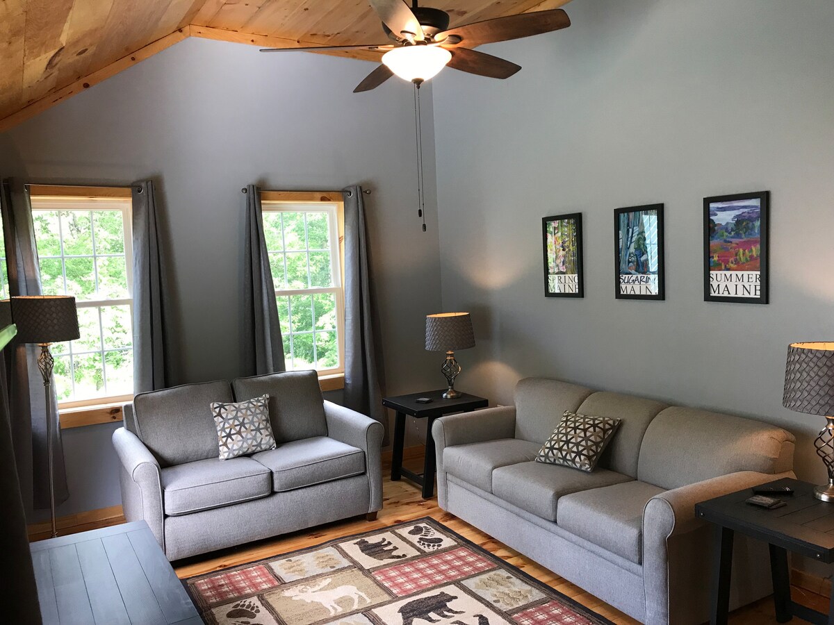 Our newly built, modern cabin offers a secluded and relaxing retreat in Union, Maine. With the high ceilings, open floor plan, and many windows, guests are surrounded by natural light and forest views. The cabin has a fully equipped kitchen, a cozy fireplace, and an outdoor grill and fire pit. Walking trails connect the cabin to our farm next door, where you can visit with our horses, donkeys, goats, chickens, and ducks. We are just 25 minutes from the Midcoast's shops, restaurants, and beaches.