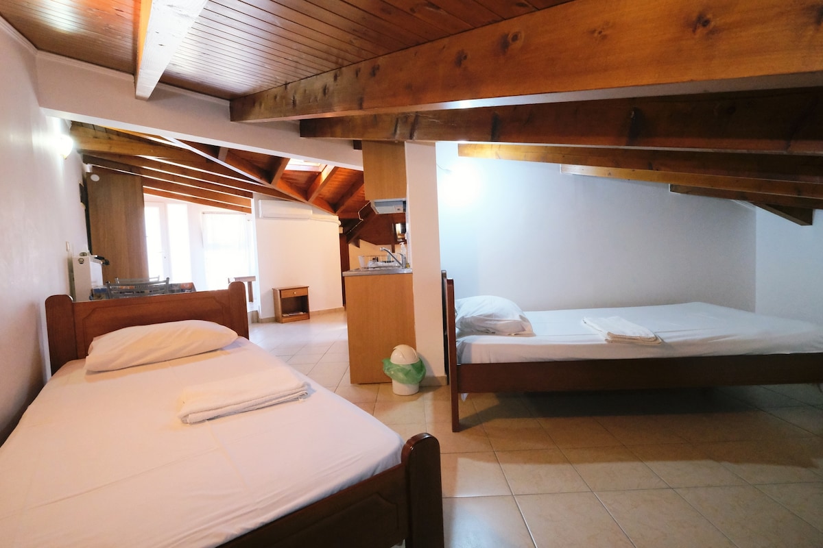 Τhird floor apartment with maisonette bedroom, large living room with sofa-bed, hosting up to 3 people, with kitchenette, fridge, wardrobe, bathroom with shower and gorgeous balcony with unobstructed view on the beach and the blue sea and sky.