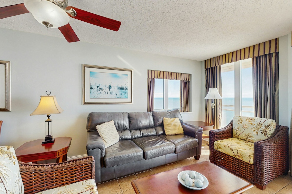 I am a proud to be a **SUPERHOST!** - Airbnb's TOP HOST Rating! This is a penthouse (11th floor) oceanfront end corner-unit located in The Oceans condo building with amazing panoramic views! There are 2 elevators in the building and an oceanfront pool with the most amazing view on the 4th floor. Location is stellar: close to grocery, restaurants, bars, mini golf, etc. Beach is wide and gorgeous here! This condo can sleep up to 9 people (8 adults and 1 baby). Fresh towels & linens included.