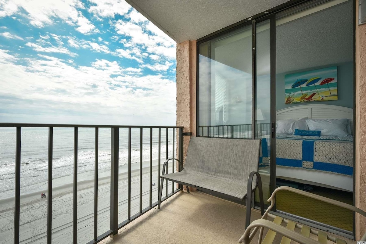 I am a proud to be a **SUPERHOST!** - Airbnb's TOP HOST Rating! This is a penthouse (11th floor) oceanfront end corner-unit located in The Oceans condo building with amazing panoramic views! There are 2 elevators in the building and an oceanfront pool with the most amazing view on the 4th floor. Location is stellar: close to grocery, restaurants, bars, mini golf, etc. Beach is wide and gorgeous here! This condo can sleep up to 9 people (8 adults and 1 baby). Fresh towels & linens included.