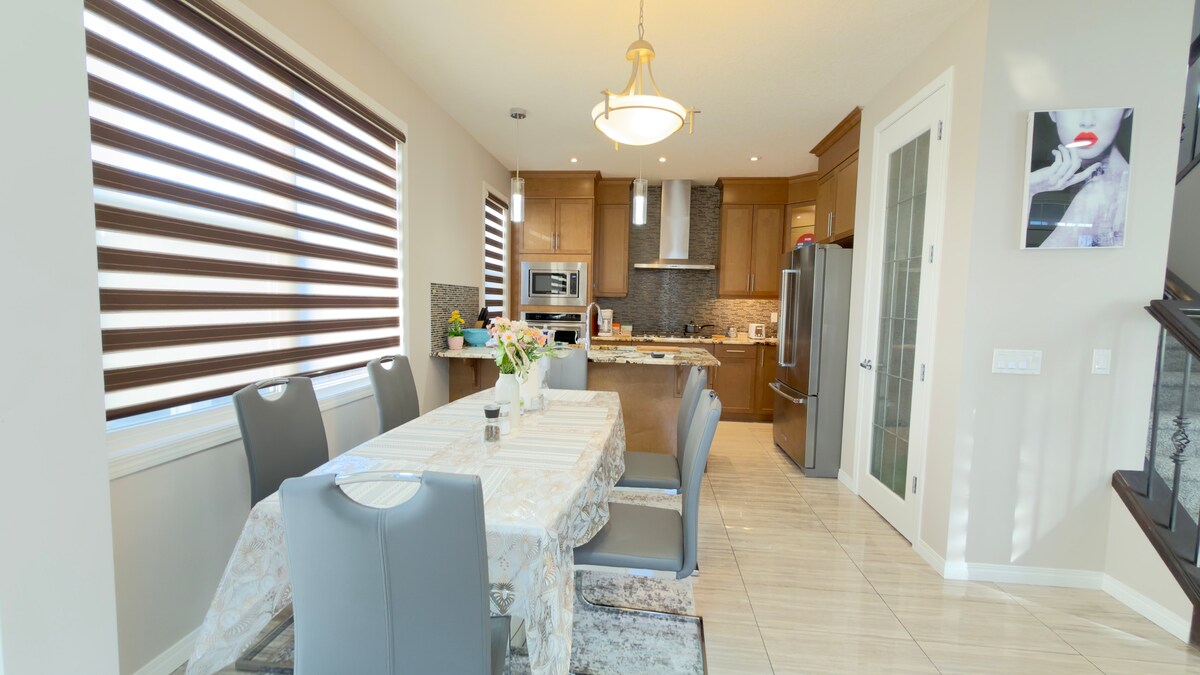 Welcome to our brand new townhouse with all the love of our family. We have infinite love for this little home. As a family with a large family travel experience, we carefully arranged the family room to give a comfortable travel experience for small families. Double rooms and large beds also provide enough spacious and bright space for a family of four. Newly installed central air conditioning + smart TV + Netflix membership especially for summer. It is worth mentioning that our townhouse is in a great location, within a 15-minute drive to Calgary International Airport, and the most famous shopping malls CROSSIRON MALL, COSTCO, within a 5-minute walk to McDonald's, Starbucks, Timhortons, the most competitive Nofrills affordable supermarket. Note: This warm townhouse is only an hour and a half drive from the world-famous Banff National Park, and you can also visit the stunning Lake Louise, Hoodoos Trail Head, Bow Falls viewpoint... and other wonderful natural scenery.