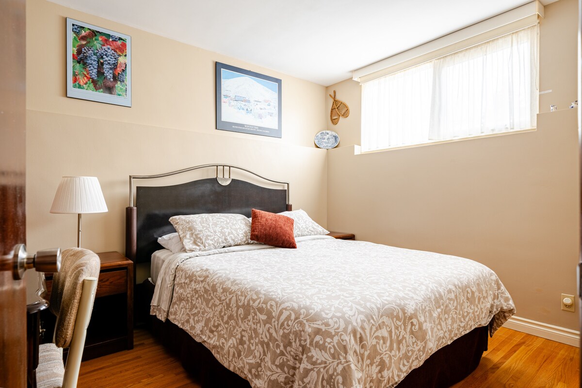 Unwind with the whole family in this peaceful and private walkout basement suite. Enjoy the comfort of your own separate entrance, a cozy living area, a bedroom with a queen-sized bed, in-suite laundry, and views of a beautifully landscaped backyard. The kitchenette comes equipped with an induction cooktop, microwave, and mini fridge—perfect for preparing light meals during your stay. Ideal for solo travelers, couples, or small groups—accommodates up to 4 guests.