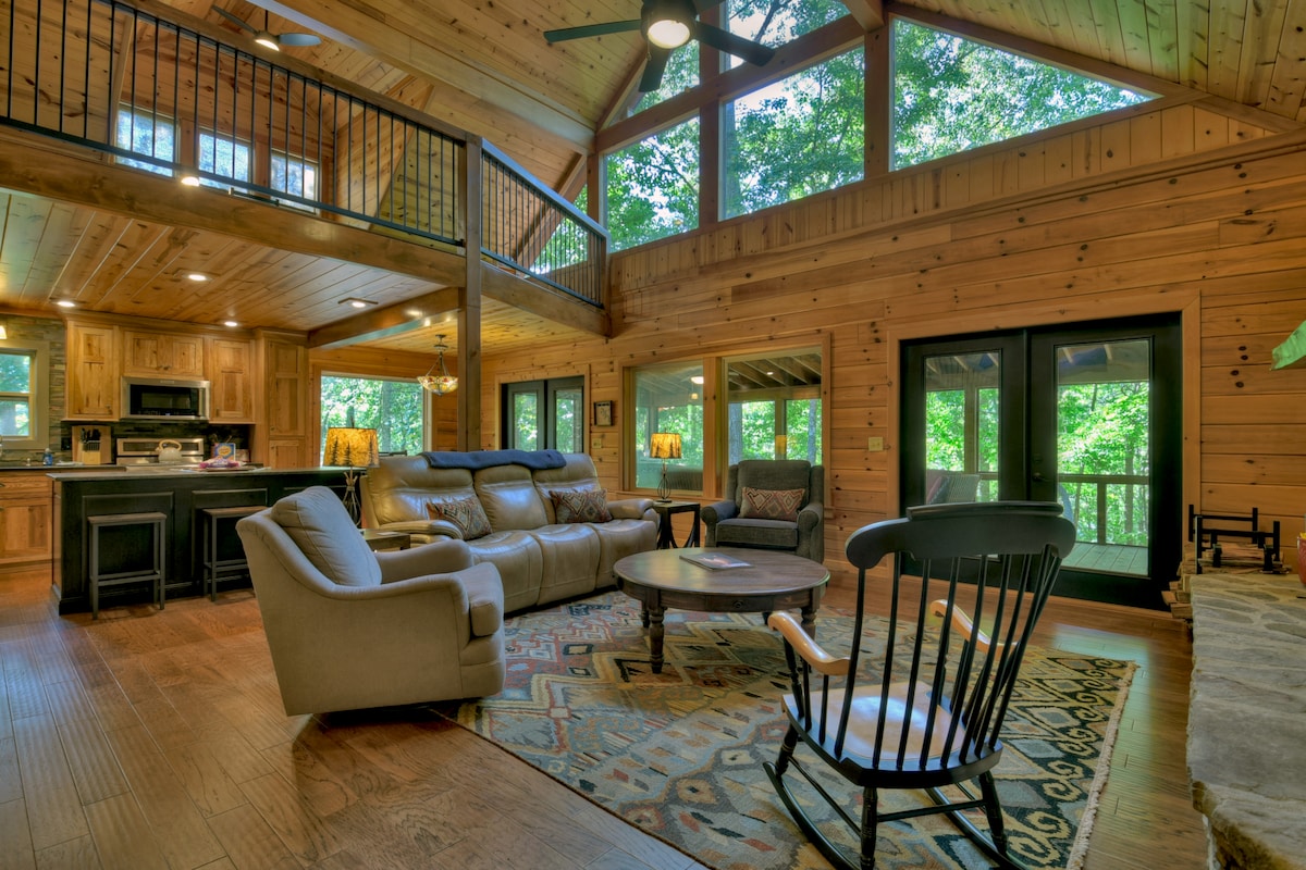 Retreat to the mountains and step into Cascading View Lodge where you will be greeted with incredible long-range mountain views. This luxury cabin is <20 min from downtown Blue Ridge. Come take in the mountain views on our screened in porch and spacious deck. We offer a fire pit underneath the stars and hot tub to enjoy with family and friends! For your comfort we offer 5 smart TVs, high speed WiFi, game room with arcade game and more, and a fully stocked kitchen! Let us help you plan your trip!