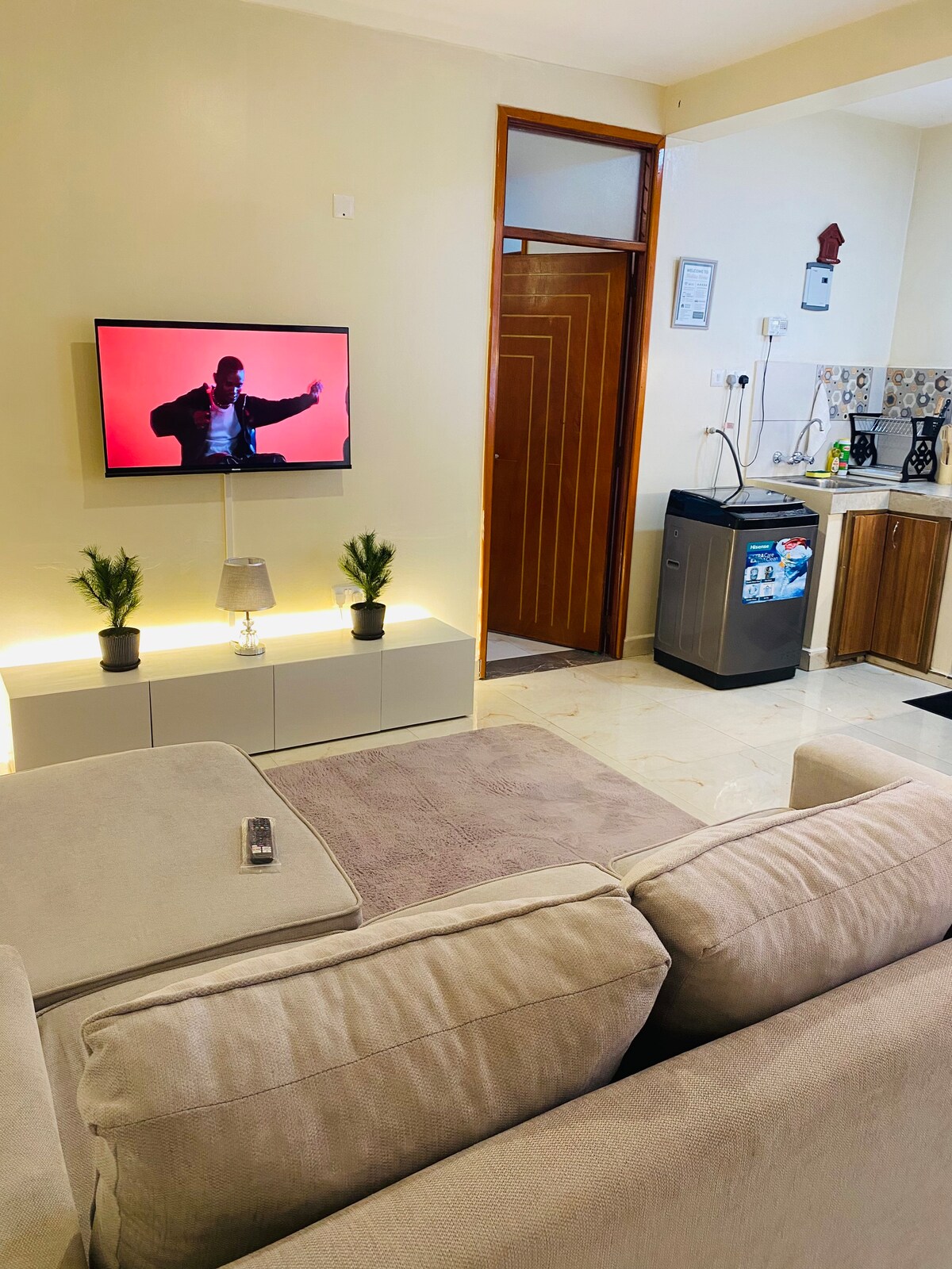 This Aesthetic One Bedroom Apartment is located in Naalya Estate near Quality Supermarket. It’s a few minutes drive to the northern bypass connection leading you to the Airport via Express Highway and close to Acacia Mall, nice restaurants and bars nearby. There are also a number of alternative routes to the city center. The amenities are; - All kitchen appliances eg. Rice cooker, Coffee machine, Blender - Fast Speed WI-FI - 55inch Samsung smart tv - Samsung sound bar - Washing Machine