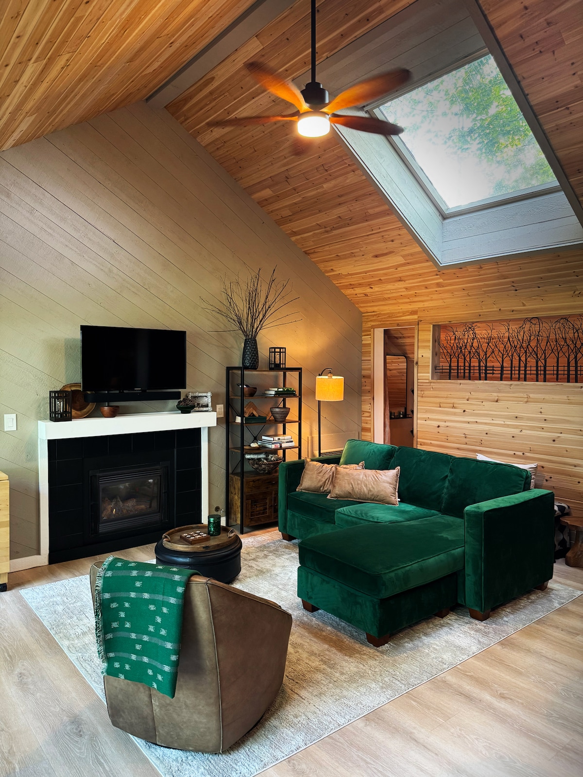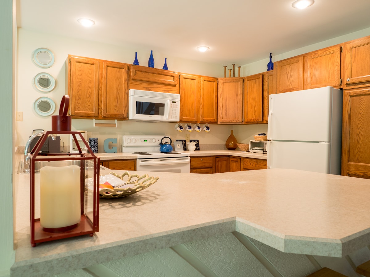 This condo is an end unit which overlooks the Shanty Creek golf course and lake Bellaire. Enjoy modern décor, leather couches, a fully stocked kitchen (fridge, stove, oven, dishwasher, coffee maker, hot water heater, microwave and toaster), all TVs are Amazon Fire so login to your prime account, and you’ll have access to Netflix, Youtube, Disney+ or any other streaming service you subscribe to. Snuggle up next to a wood fireplace (firewood available for purchase at Family Fare or local farms).