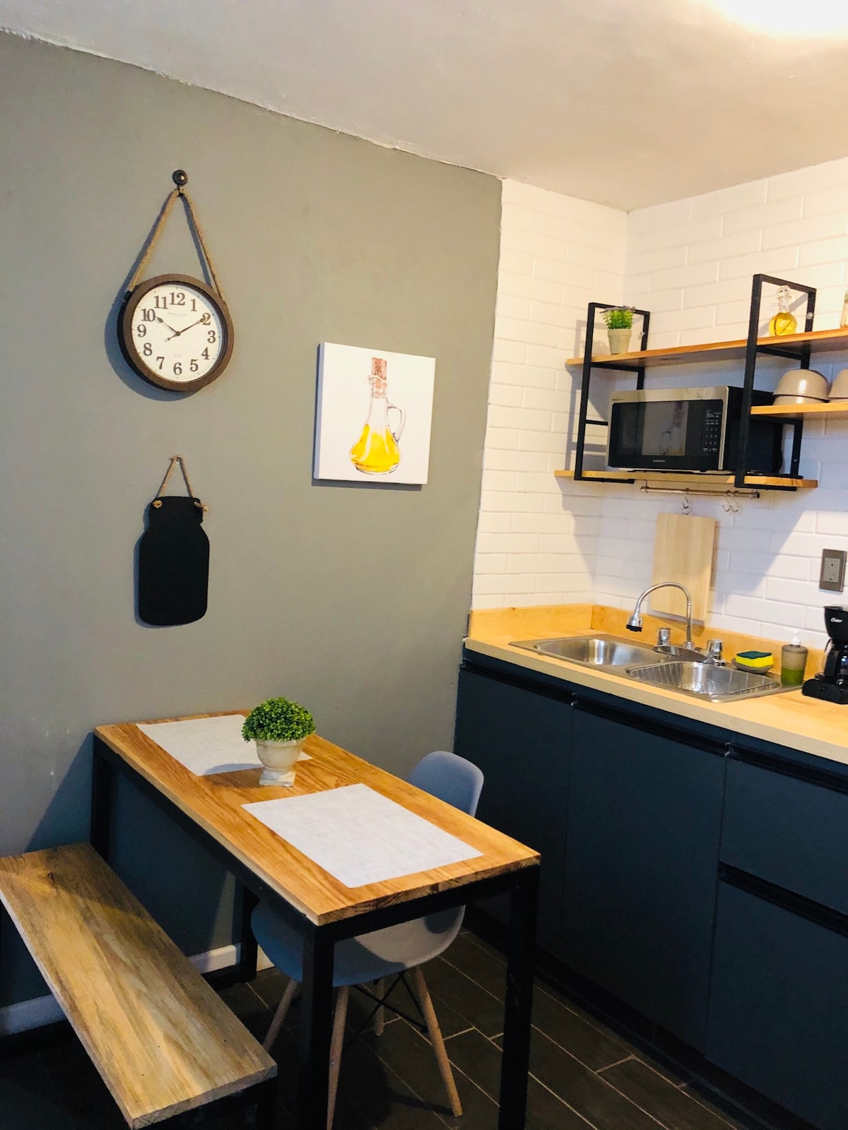 Pequeño Departamento Estudio En el Centro Histórico Cama king size con colchon cómodo calidad Premium Smart tv 55” con cable y Netflix gratis!!! WiFi Perchero Plancha Cocina con: Estufa Mesa con banca y silla Refrigerador Horno de microondas Cafetera Agua purificada Platos, tazas y vasos Sartenes para cocina Cafe, azúcar y crema Aceite Sal Cucharas, tenedores y cuchillos Baño con: Toallas Secadora cabello Jabón corporal Shampoo