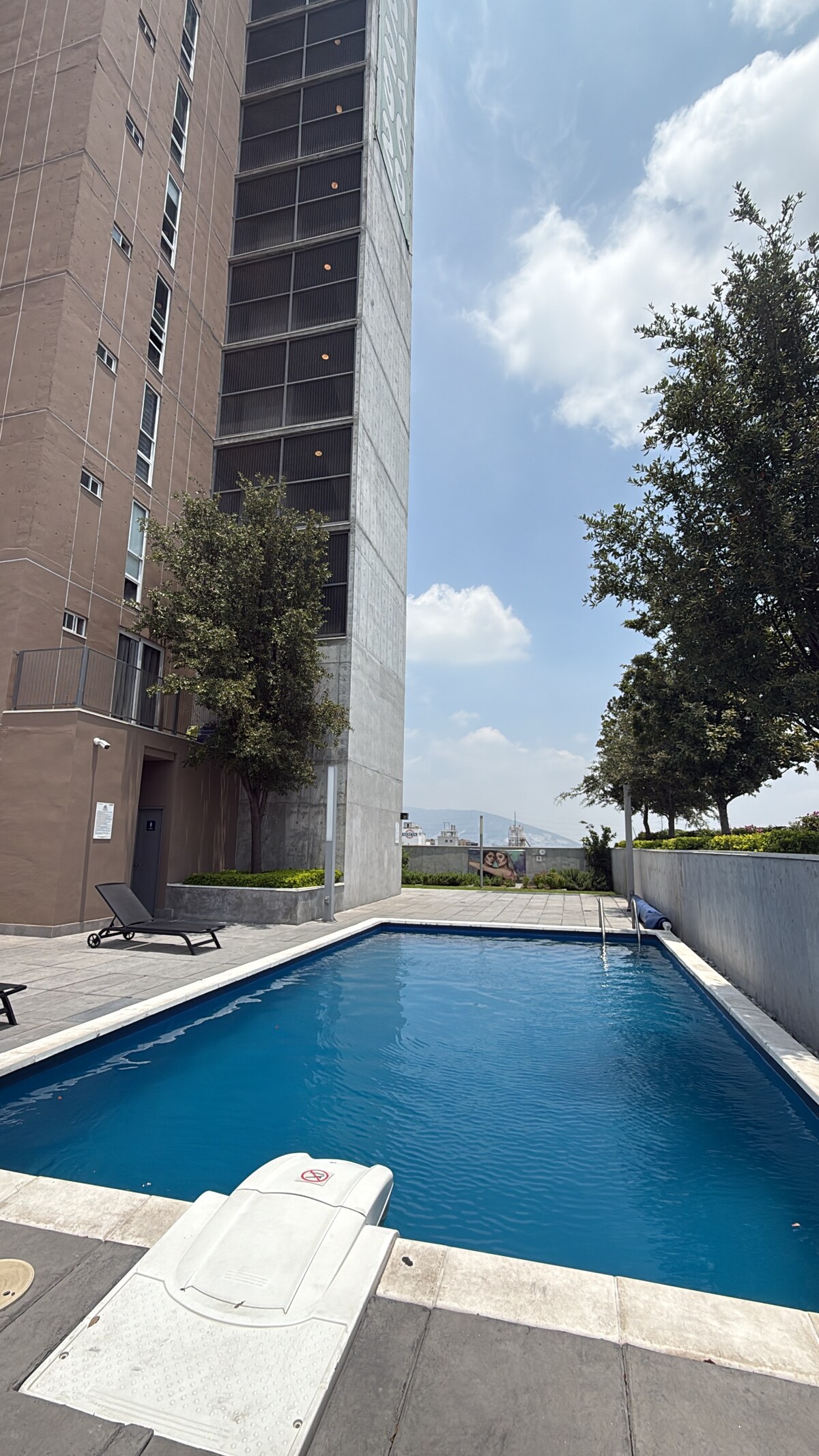 Beautiful and spacious apartment located in the best area of San Pedro Garza Garcia, with beautiful views, in a very cozy complex, with pool and palapa. It has wifi, smart TV, 24/7 security, the main room has a nice loft. The dining room has a wooden floor and double heights, which makes it very warm and bright. Right there you'll find a sofa bed and a desk. There are two full bathrooms and a half bathroom. It has one covered parking space and one uncovered parking space.